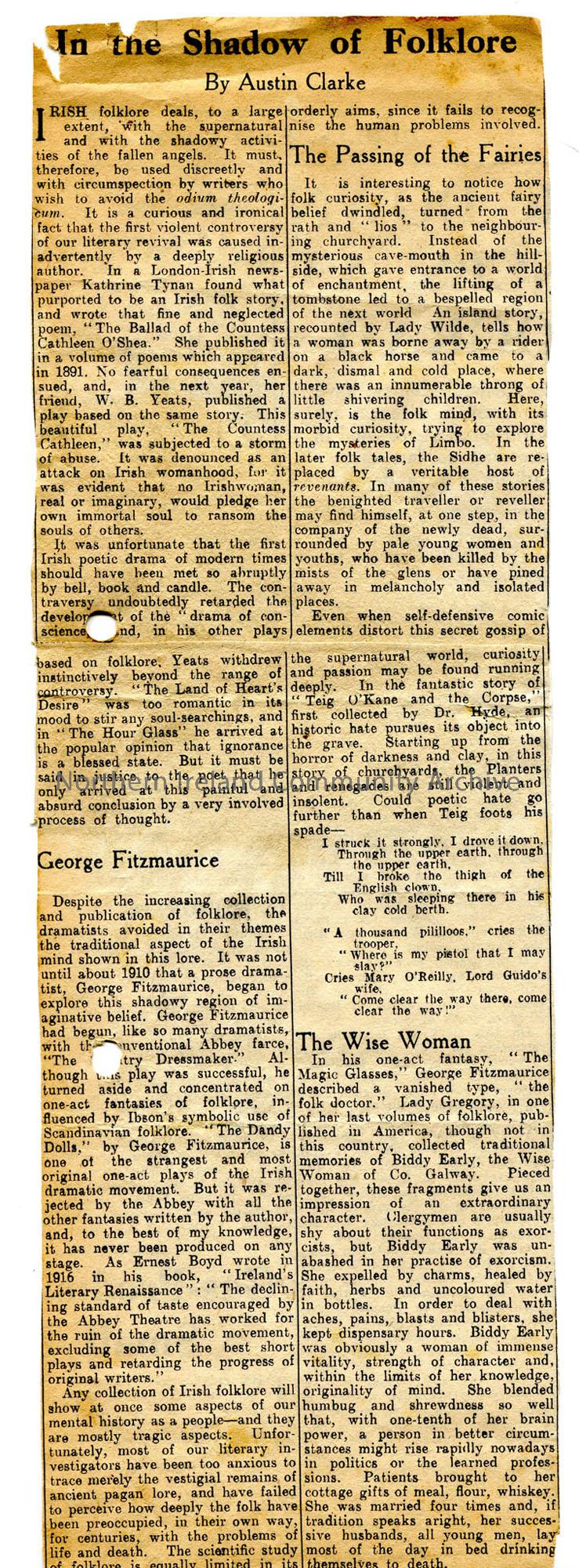Newspaper cutting – 2 pieces joined in middle by affixing to small piece of paper behind. Article entitled ‘In the Shadow of Folklore’ – about Irish f…