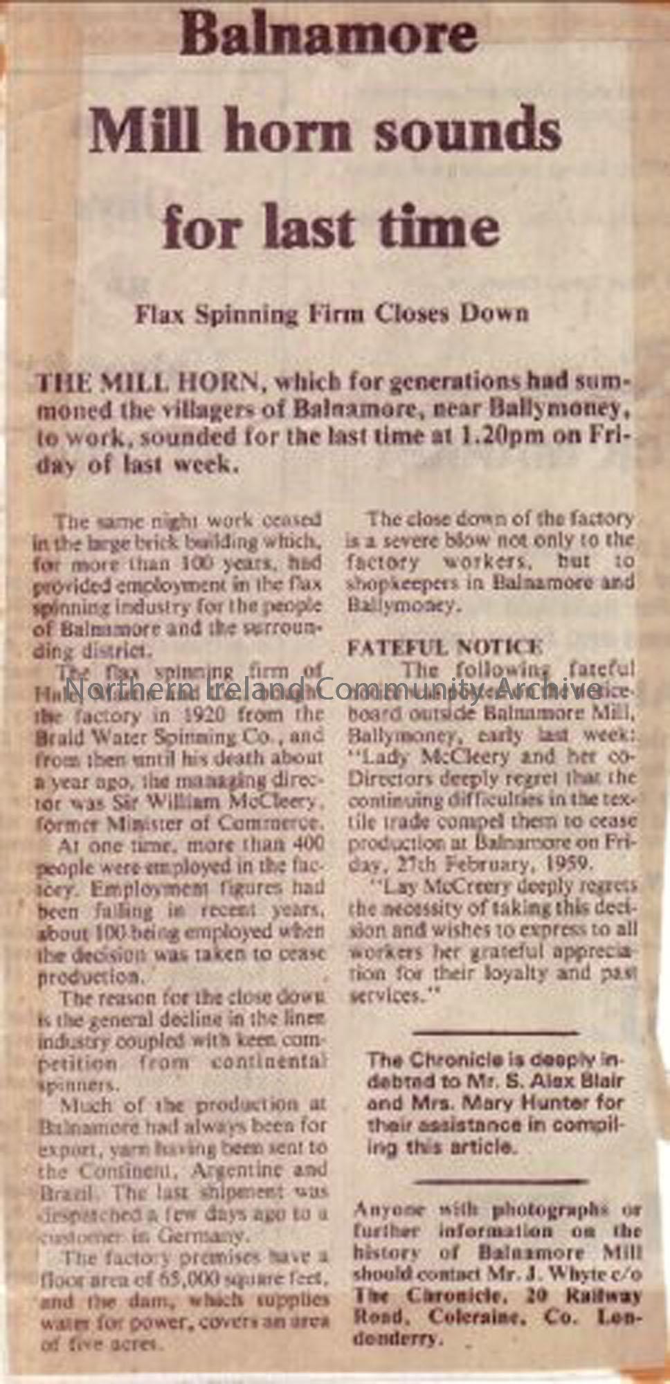 Newspaper cutting about closure of Balnamore Mill. Balnamore Mill Horn sounds for the last time