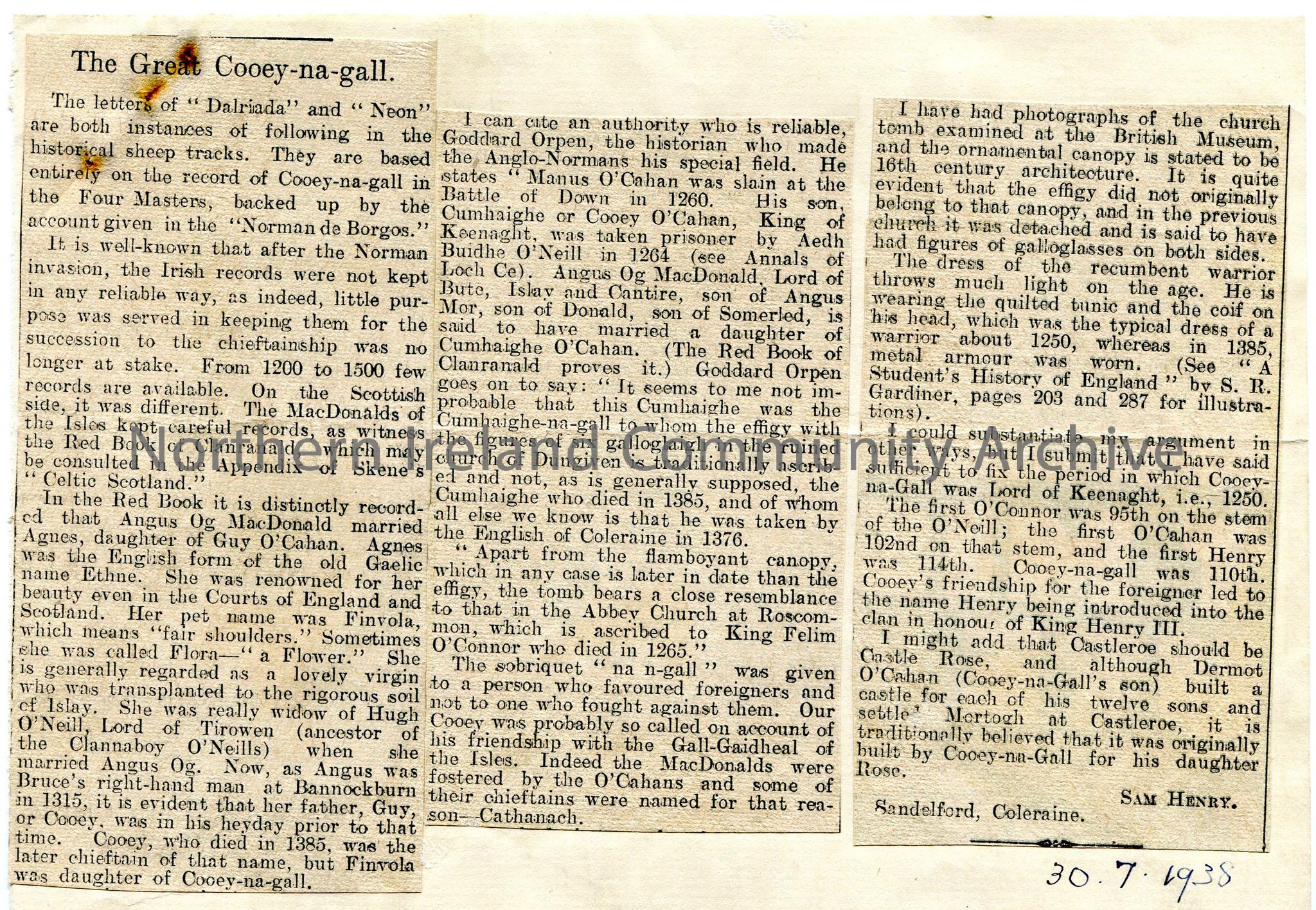 Newspaper cutting affixed to page - letter from Sam Henry with title 'The Great Cooey-na-gall' re O'Cahan family, of genealogical interest, including Scottish links. Mentions Dungiven, Islay, Bannockburn.