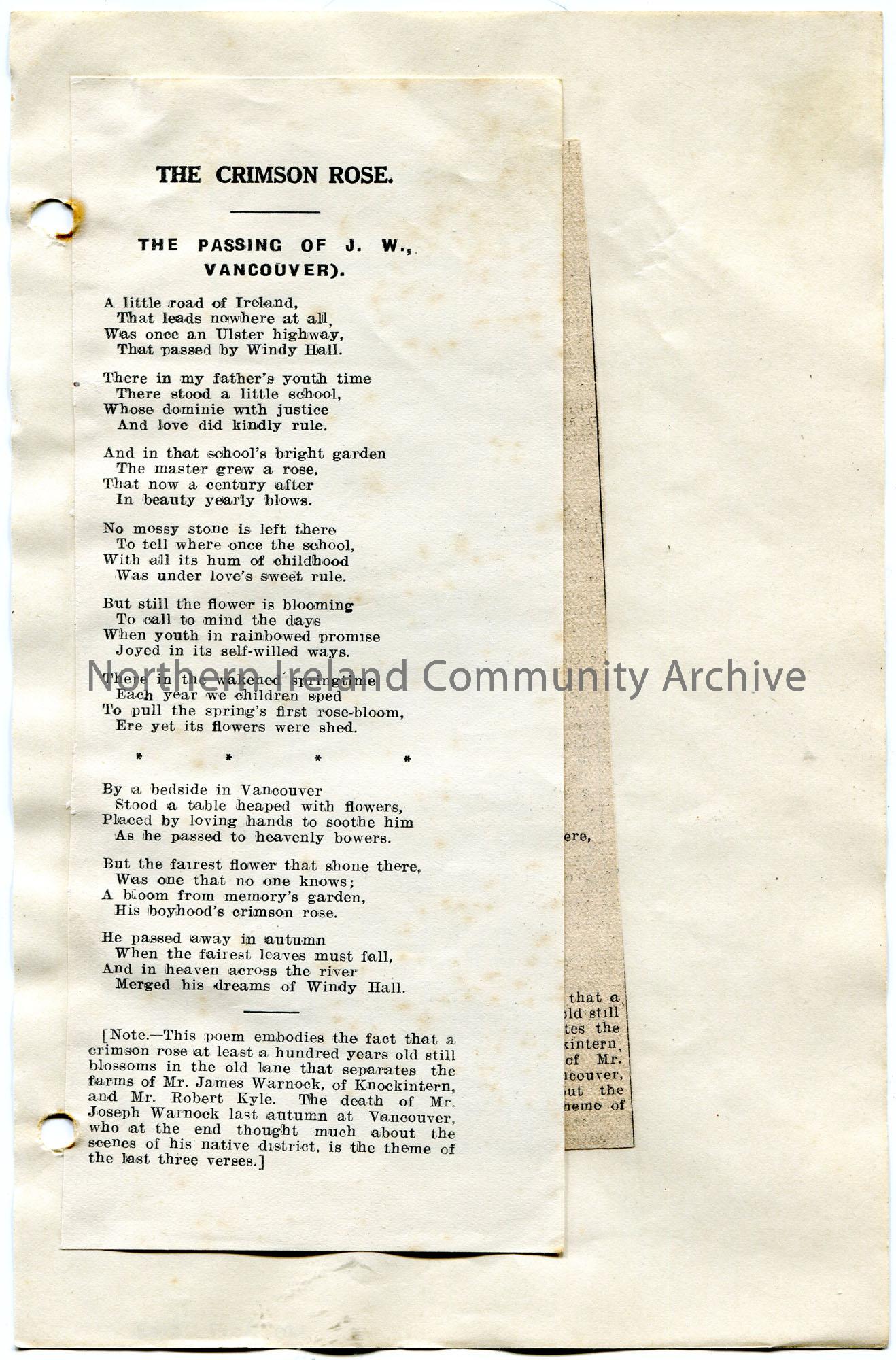 Newspaper cutting and copy of a poem both stuck to page. Poem titled, 'The Crimson Rose'. Re the passing of J. W., Vancouver. Mentions a Mr James Warnock, Knockintern, Mr Robert Kyle and Mr Joseph Warnock.