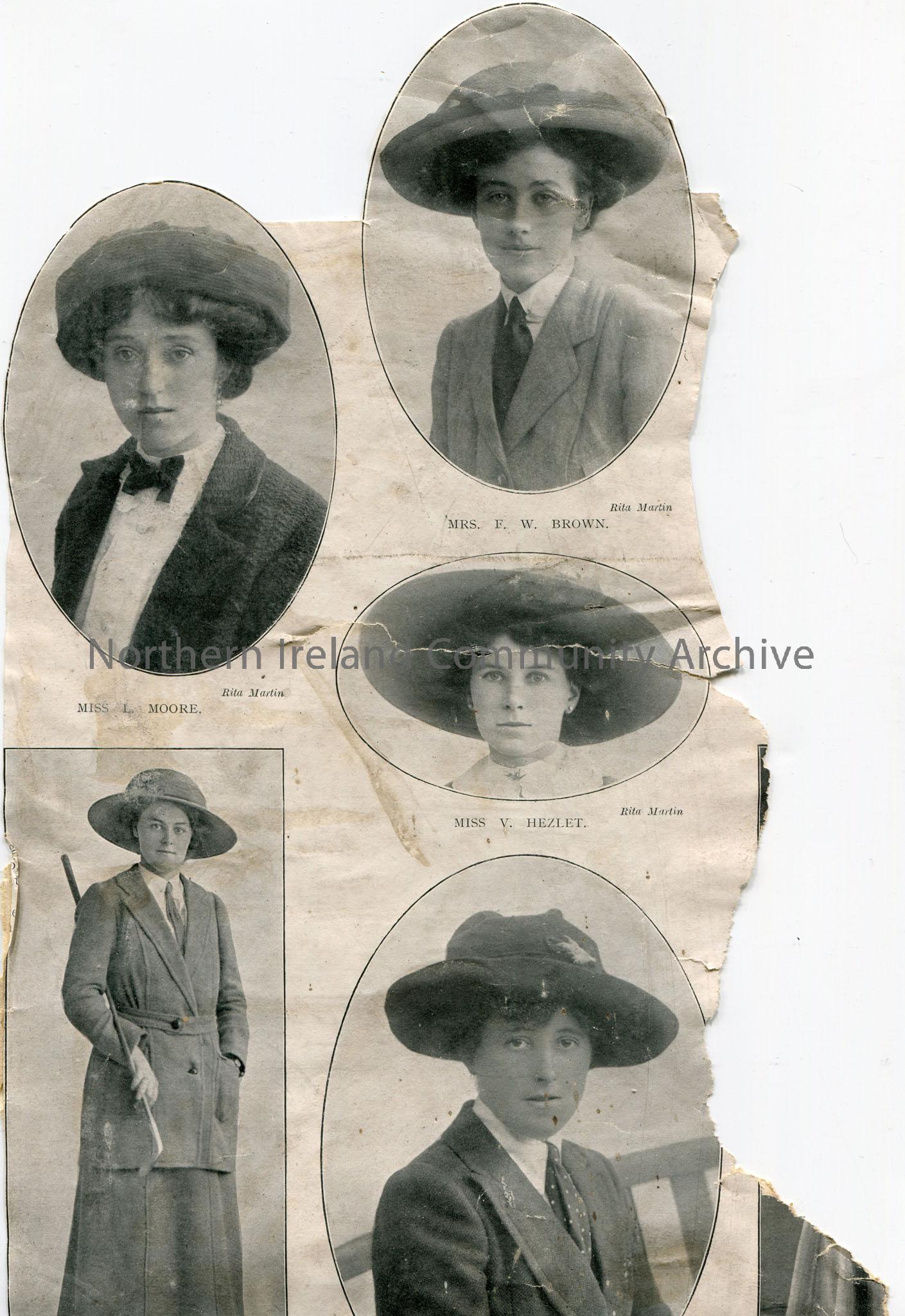 Newspaper cutting captioned, 'Some of the players who took part in the golf match between ladies an...played at Stoke Poges on April 28th'. Five images captioned, 'Mrs. F. W. Brown', 'Miss. L. Moore', 'Miss V. Hezlet', 'Miss Ravenscroft', 'Miss Mabel Harrison'.