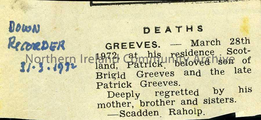 newspaper cutting detailing the death of Mr Patrick Greeves