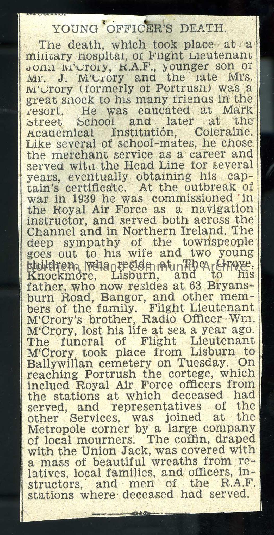 Newspaper cutting detailing the life and death of Flight-Lieutenant John McCrory