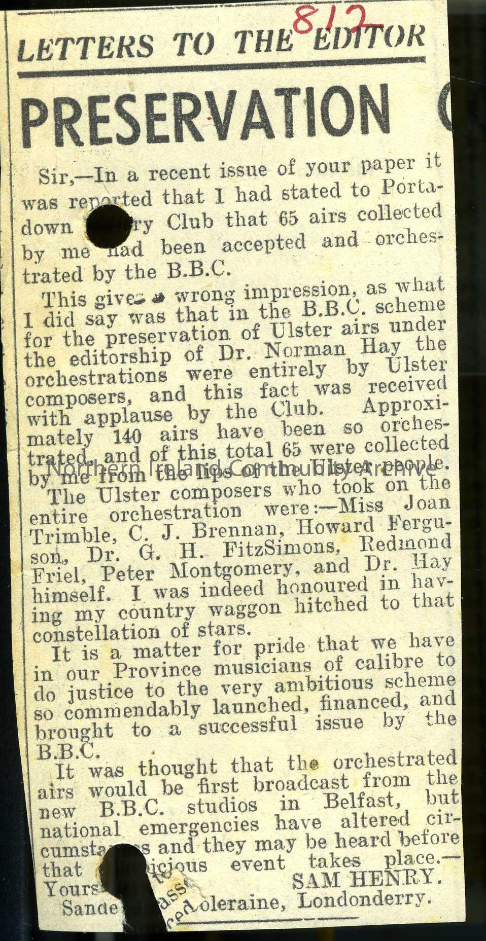 Newspaper cutting from ‘Letters to the Editor’ – a letter from Sam Henry correcting a recent report about Sam’s part in a BBC music project.