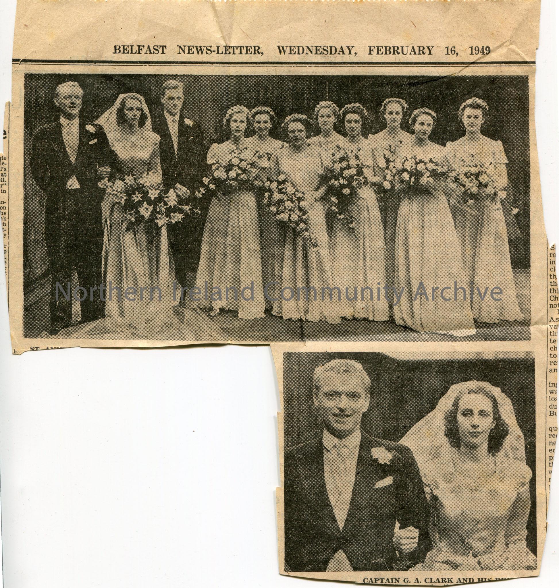 Newspaper cutting from the Belfast News-Letter, Wednesday, 16th February, 1949. Two images- one of a wedding party and the other of the bride and groom which is captioned 'Captain G. A. Clark and his Bride'.