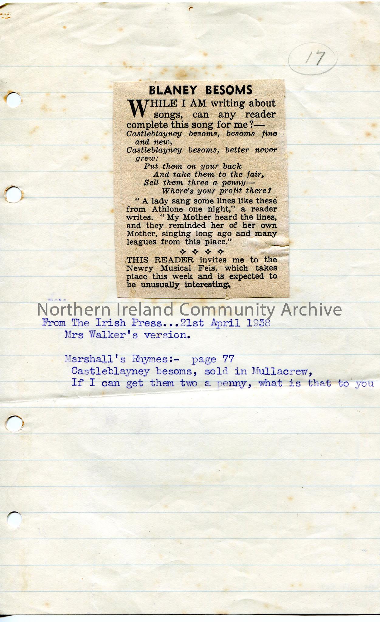 Newspaper cutting from The Irish Press dated 21st April, 1938. 'Mrs Walker's version'. Cutting is titled, 'Blaney Besoms' and invites the reader to finish the song which has been printed re Castleblayney besoms. Below the cutting is typed lines of the song from Marshall's Rhymes, possibly the missing words.