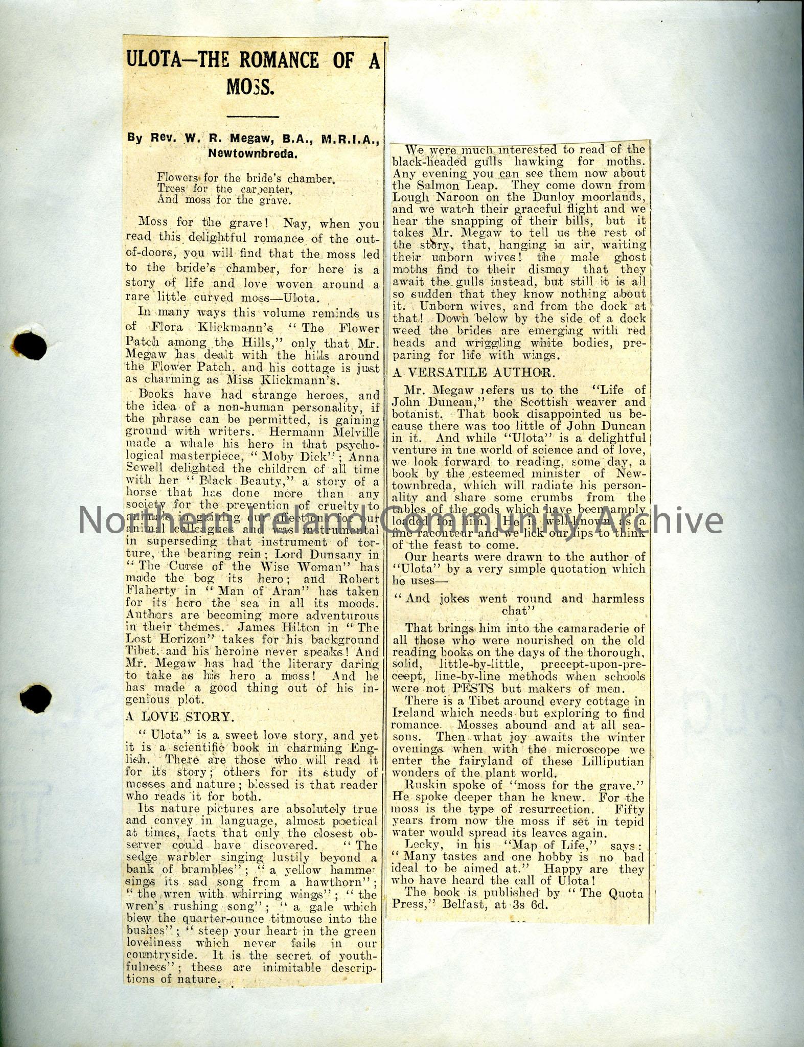 Newspaper cutting of a review of "Ulota-The Romance of a Moss", a book written by Rev. W. R. Megaw, B.A., M.R.I.A., of Newtownbreda. It is both a story and a study of mosses and nature according to Sam Henry.