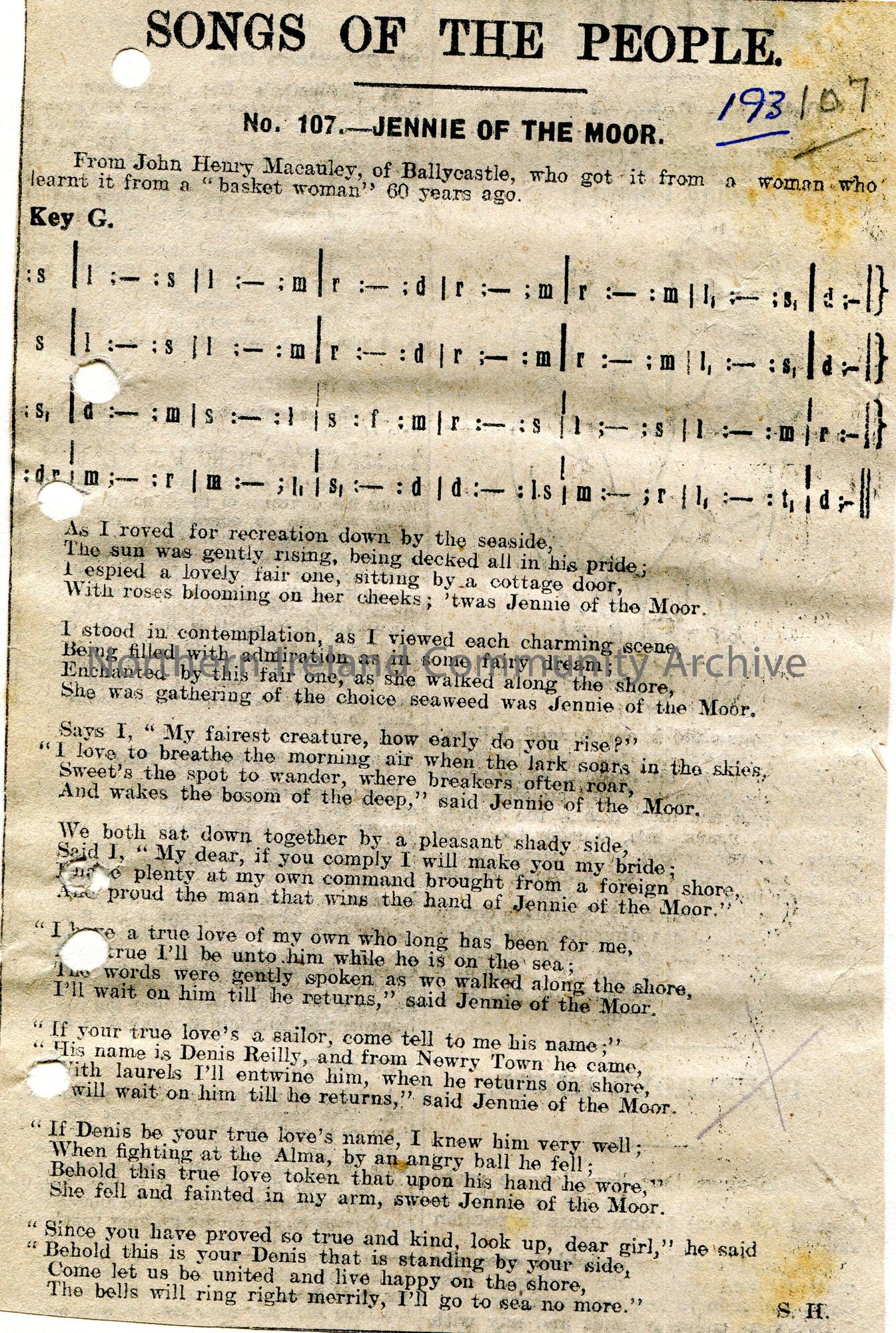 Newspaper cutting of a Songs of the People article. Tonic sol-fa notation and words to song titled, 'No. 107 - Jennie of the Moor'. From John Henry Macauley of Ballycastle, who got it from a woman, who got it from a 'basket woman'.