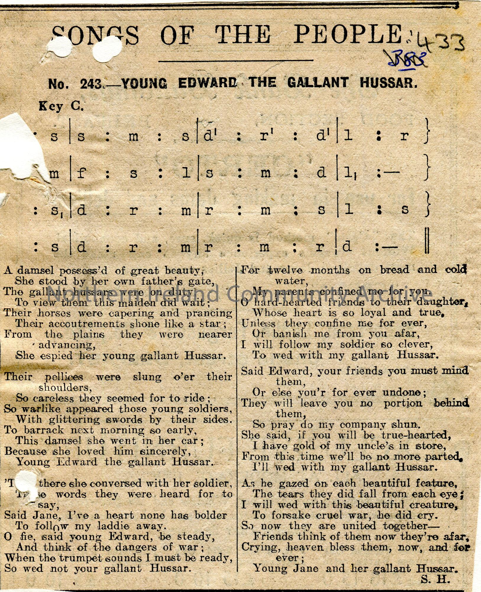 Newspaper cutting of a Songs of the People article. Tonic sol-fa notation and words to song titled, ‘No. 243 – Young Edward the Gallant Hussar’.