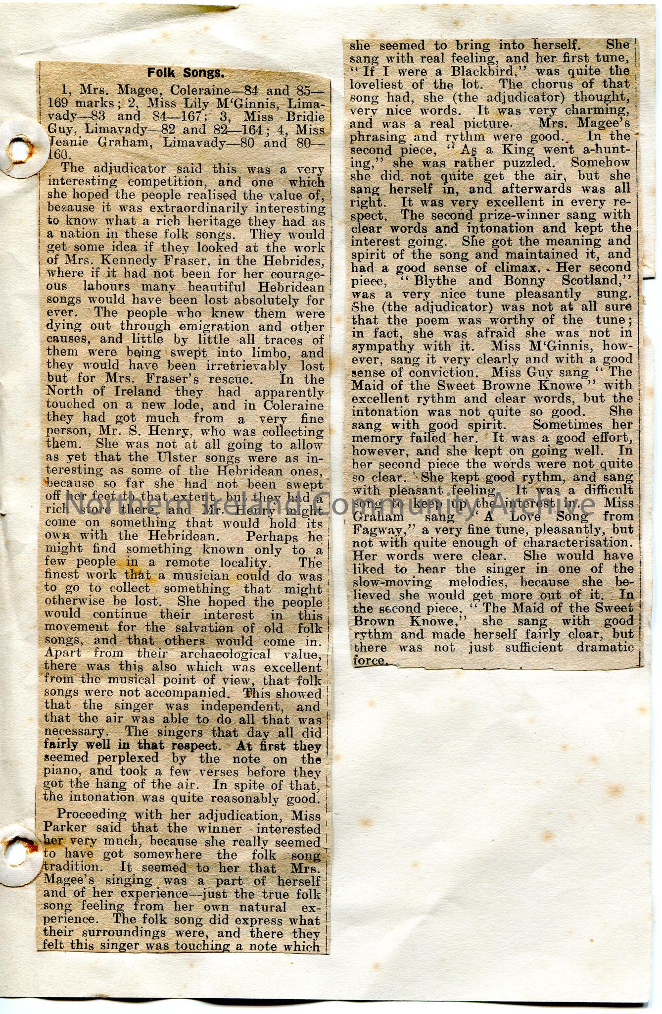 Newspaper cutting of an article titled, ‘Folk Songs’. Review of a folk song competition. Adjudicated by Miss Parker. Winner was Mrs Magee, Coleraine w…