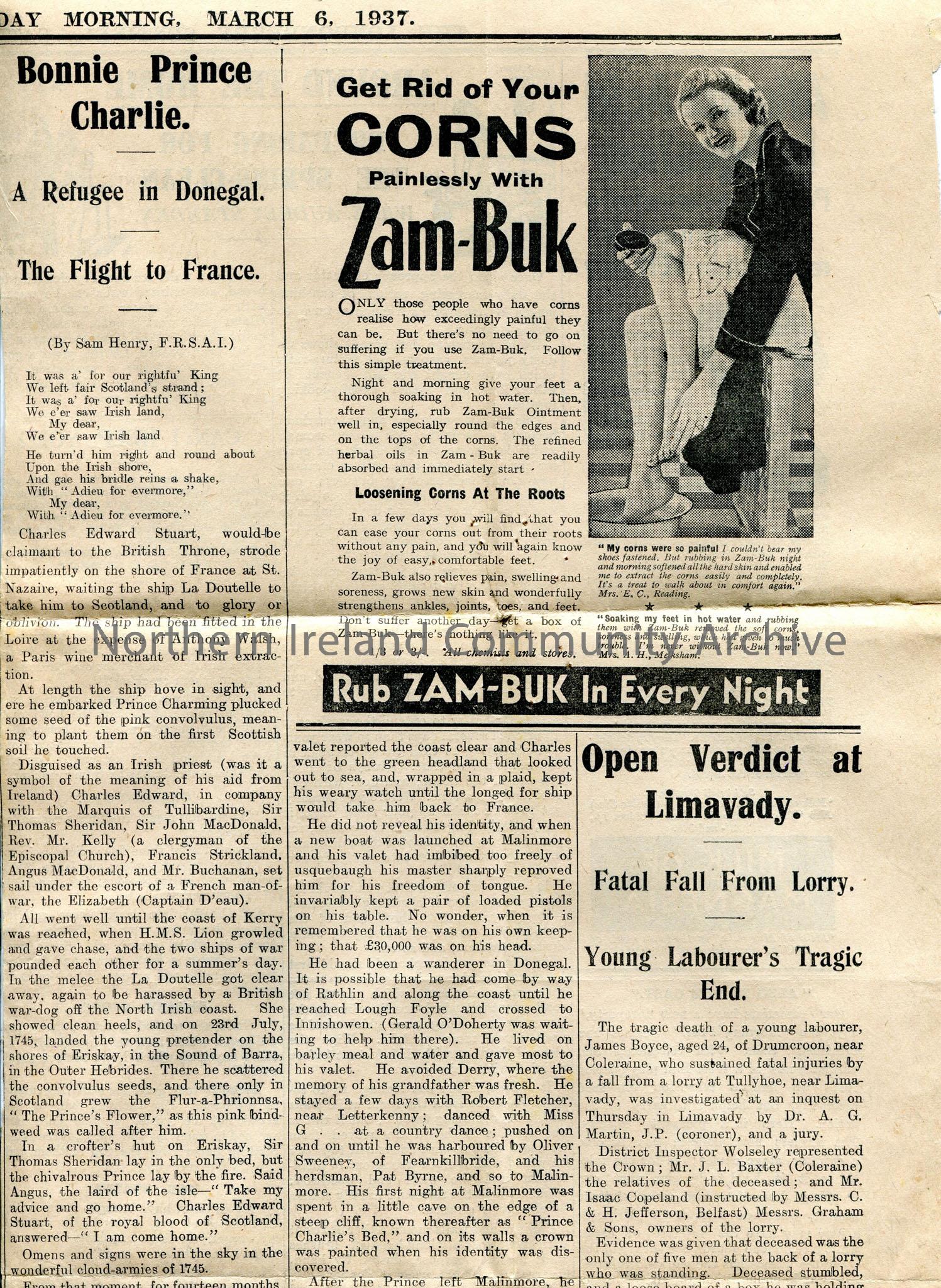 Newspaper cutting of article by Sam Henry, entitled 'Bonnie Prince Charlie - A Refugee in Donegal - The Flight to France' - about Charles Edward Stuart's supposed stay in Donegal after fleeing Scotland 1746