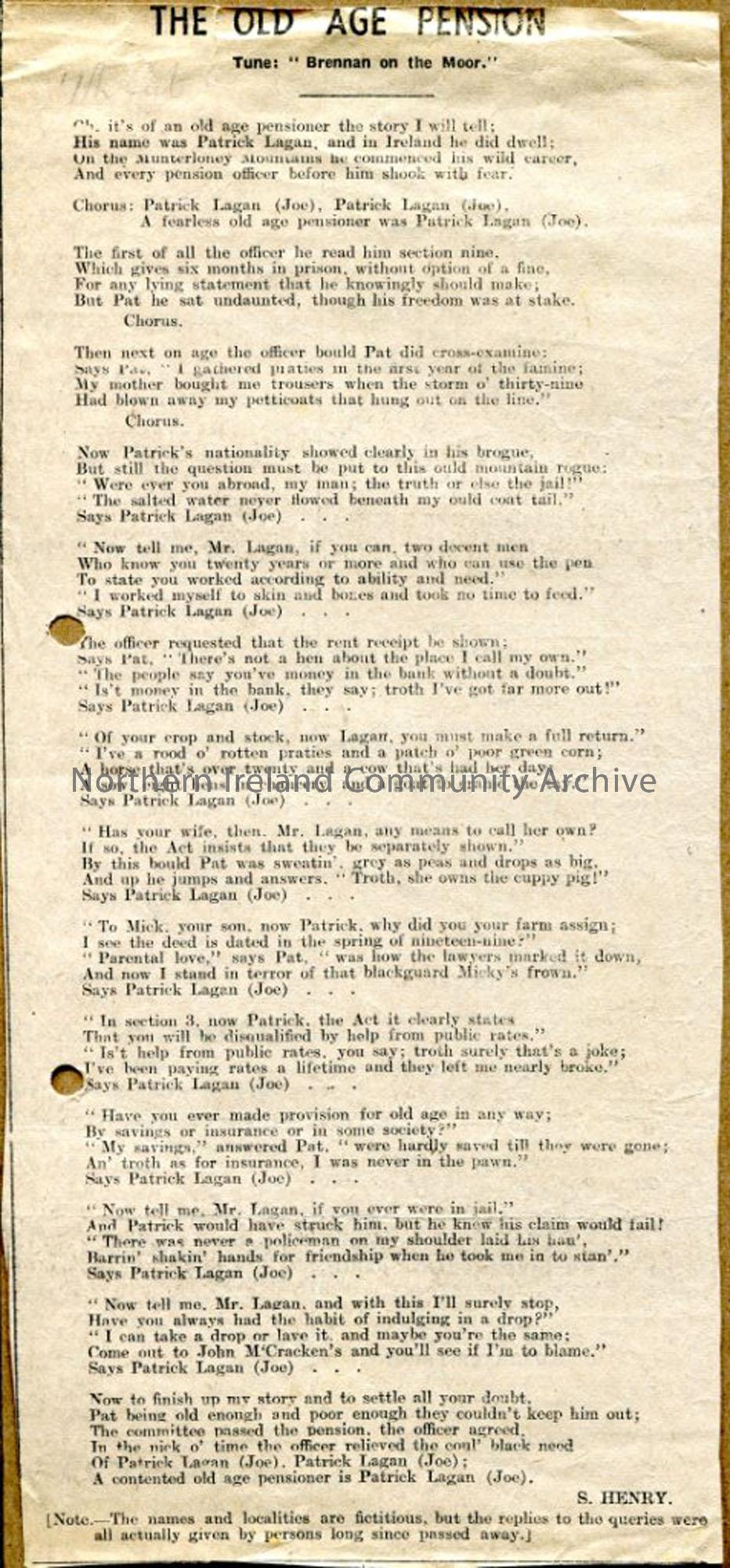 Newspaper cutting of article by Sam Henry – words to song ‘The Old Age Pension’.
