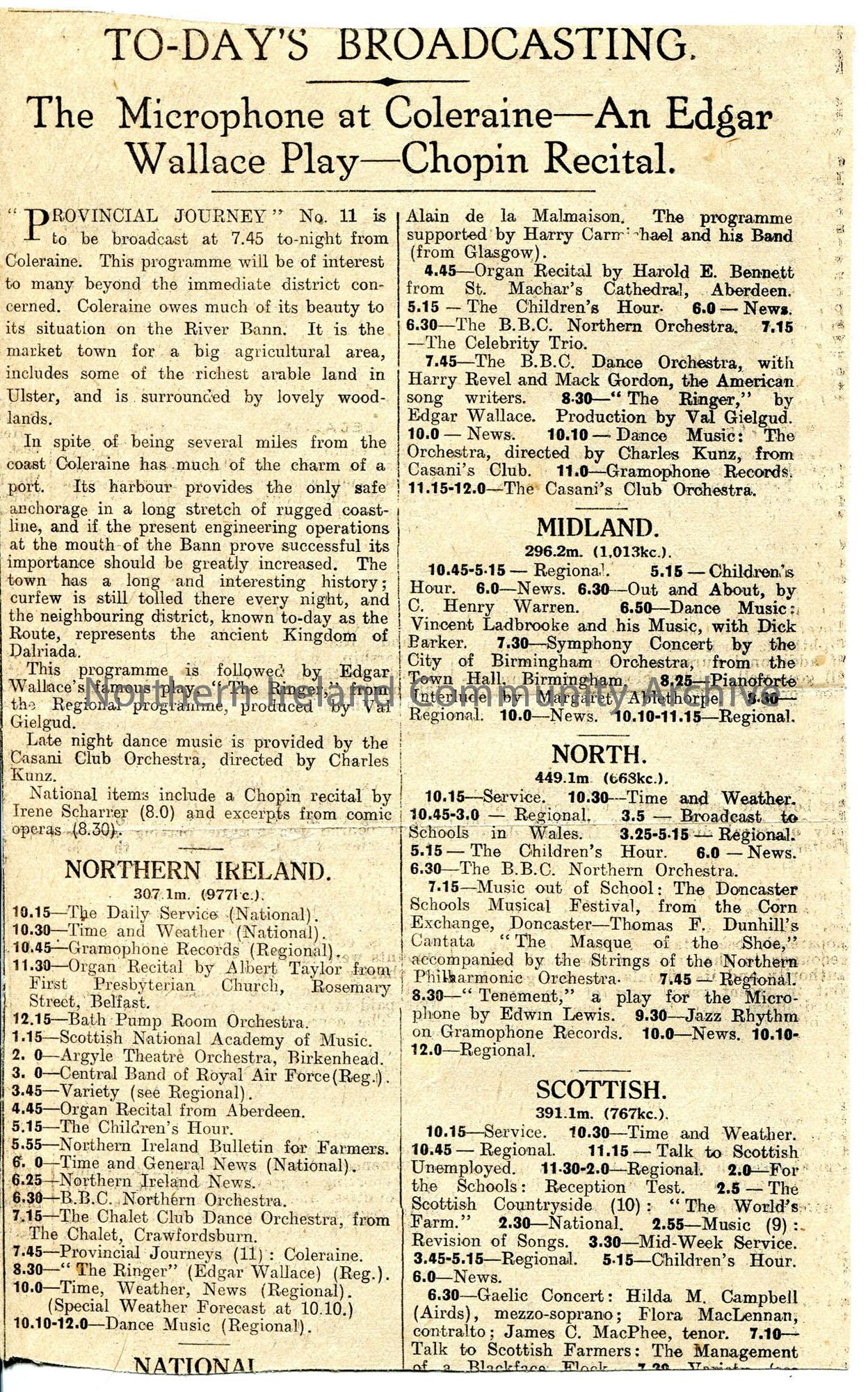 Newspaper cutting of broadcast schedules for various frequencies, which includes the Provincial Journey' programme from Coleraine, with 2 paragraphs relating to it in introduction,