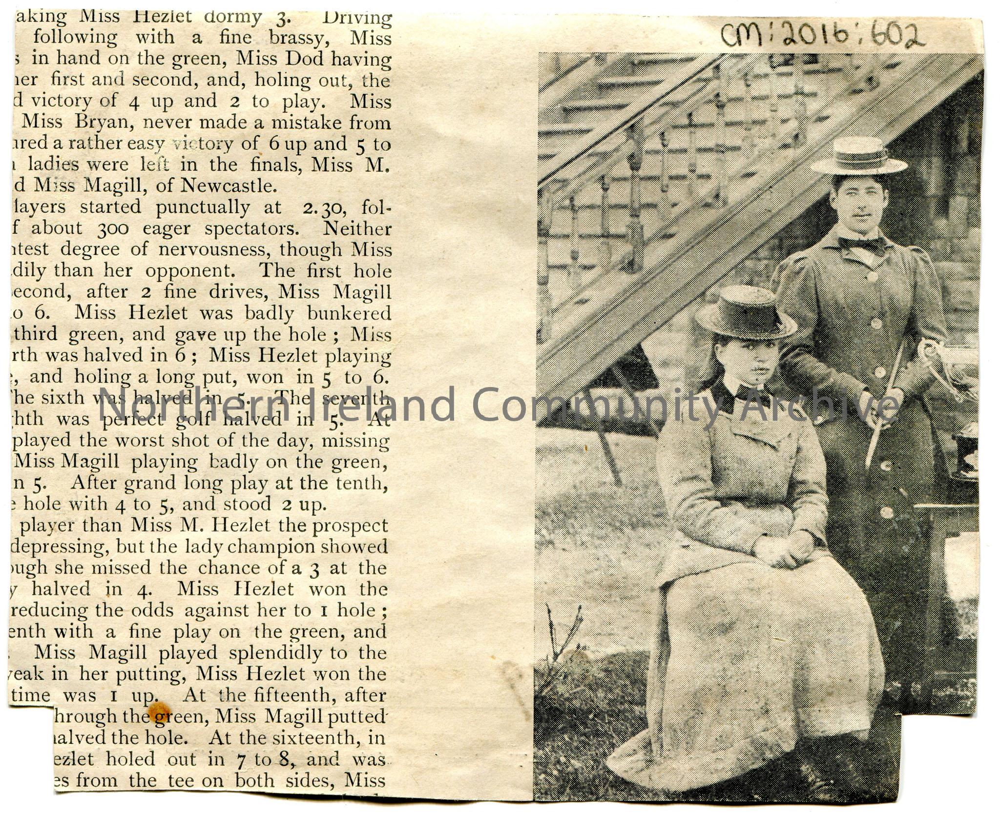 Newspaper cutting of image captioned, 'The Irish Ladies' Golf Championship. The Countess of Annesley distributing the Prizes. '1899' written in ink on image. Part of commentary of golfing game on back of page. Refers to Miss Hezlet.