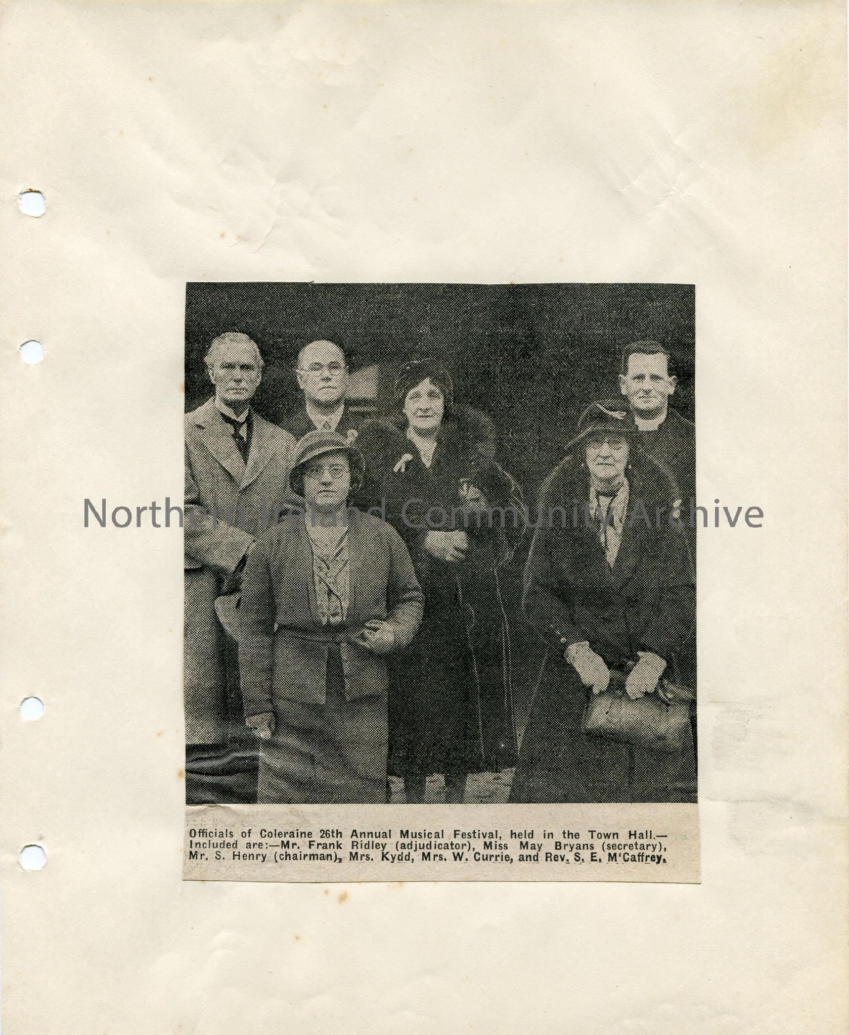 Newspaper cutting of photograph – group of officials at Coleraine Music Festival, including Sam Henry