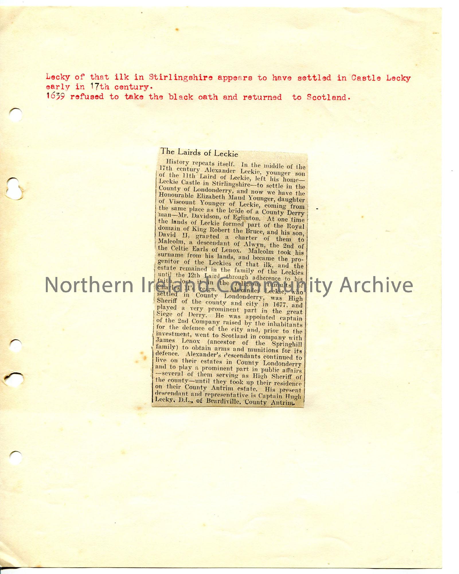Newspaper cutting affixed to page, with added t...