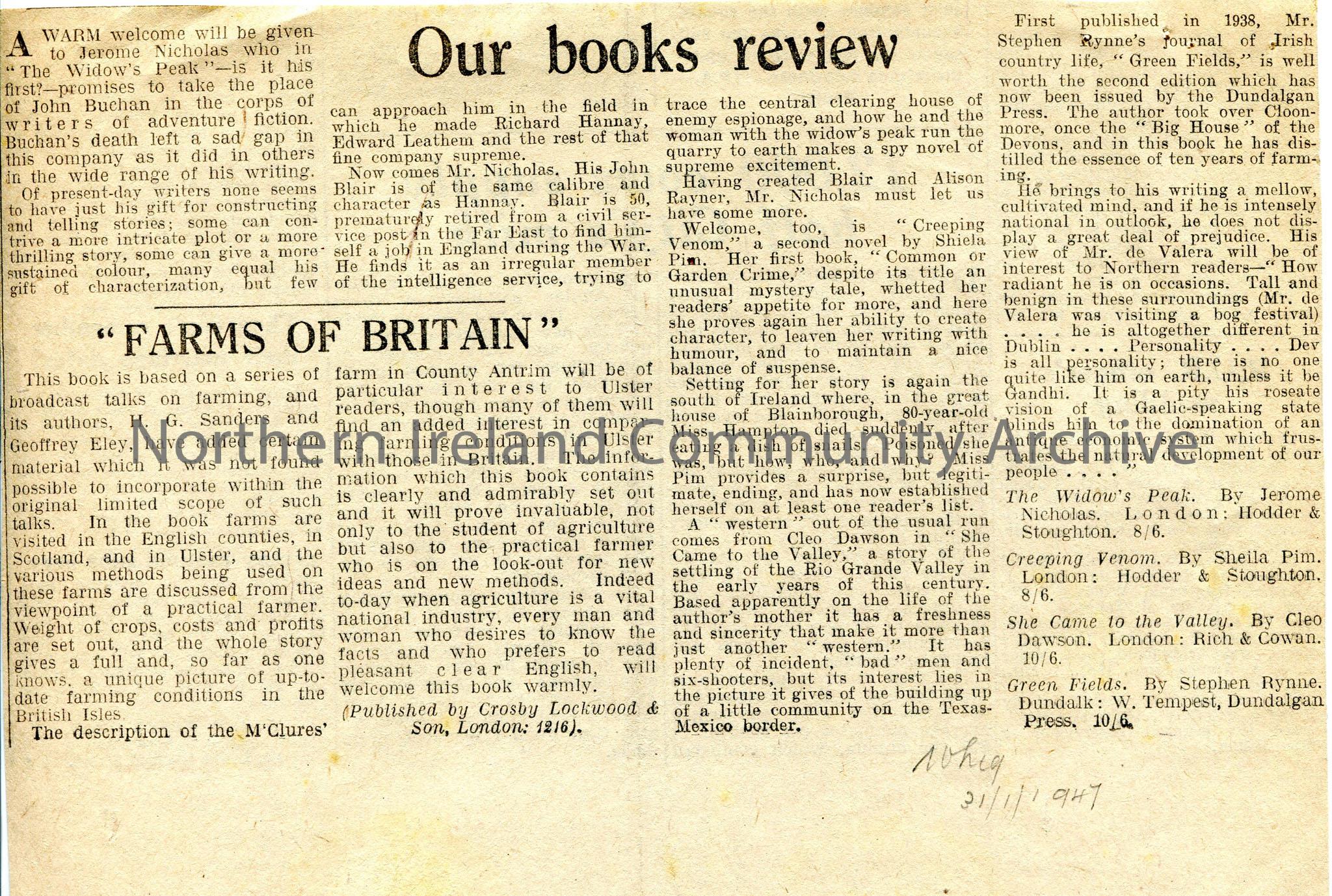Newspaper cutting of several book reviews – ‘Farms of Britain’ contains description of Co Antrim farm of McClure family