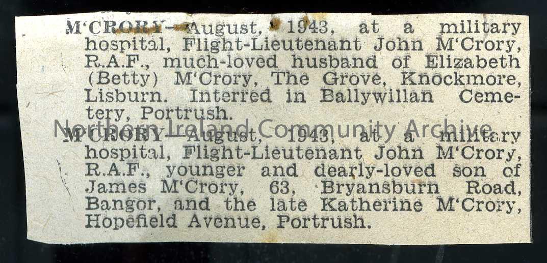 newspaper cutting of the death notice of Flight-Lieutantant John McCrory’s from his wife and from his parents