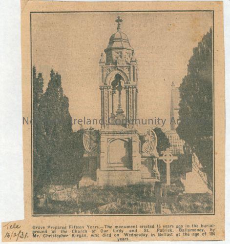 Newspaper cutting of the Kirgan Monument, Church of Our Lady and St Patrick