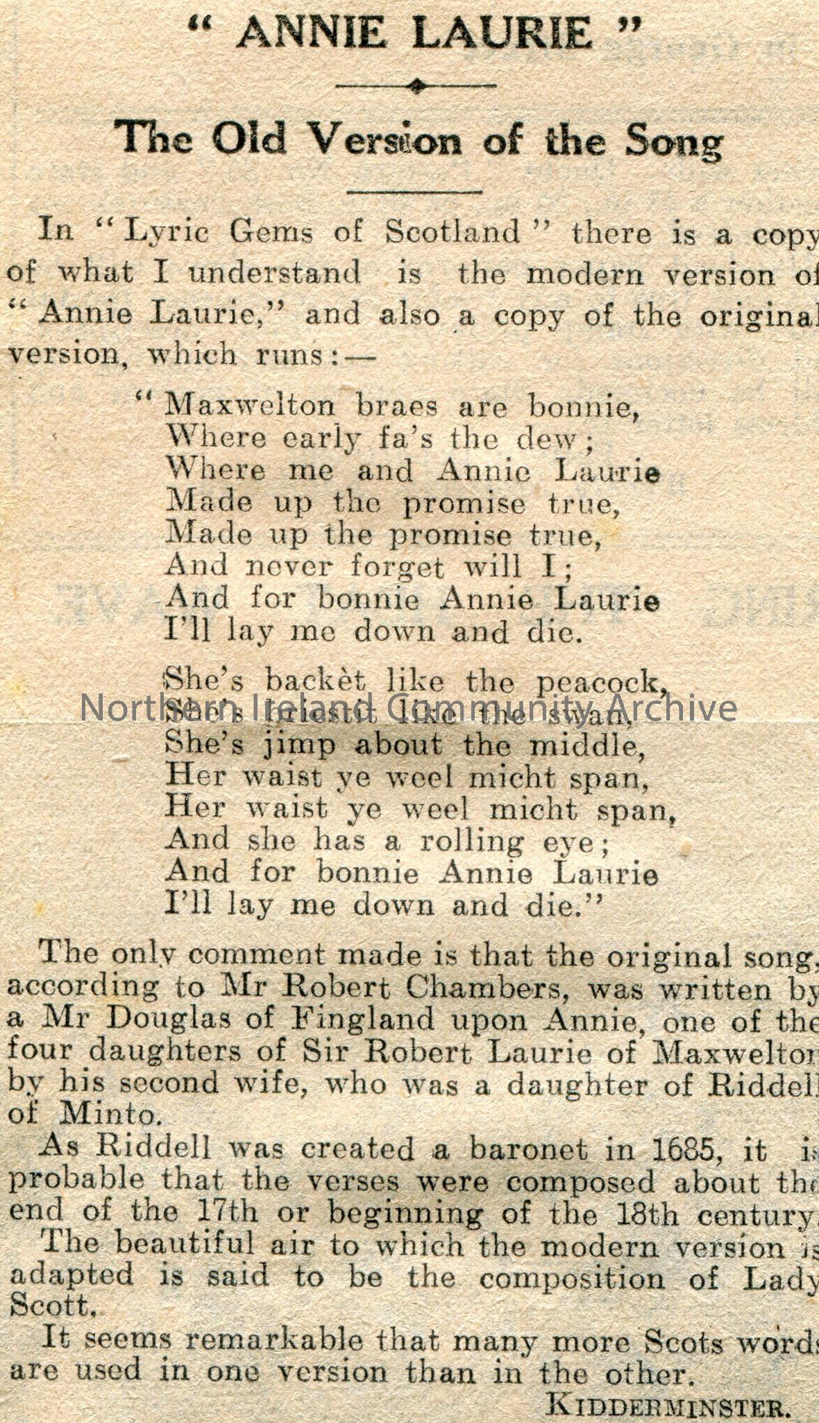 Newspaper cutting of the original version of the song ‘Annie Laurie’. Discussion of song origin.