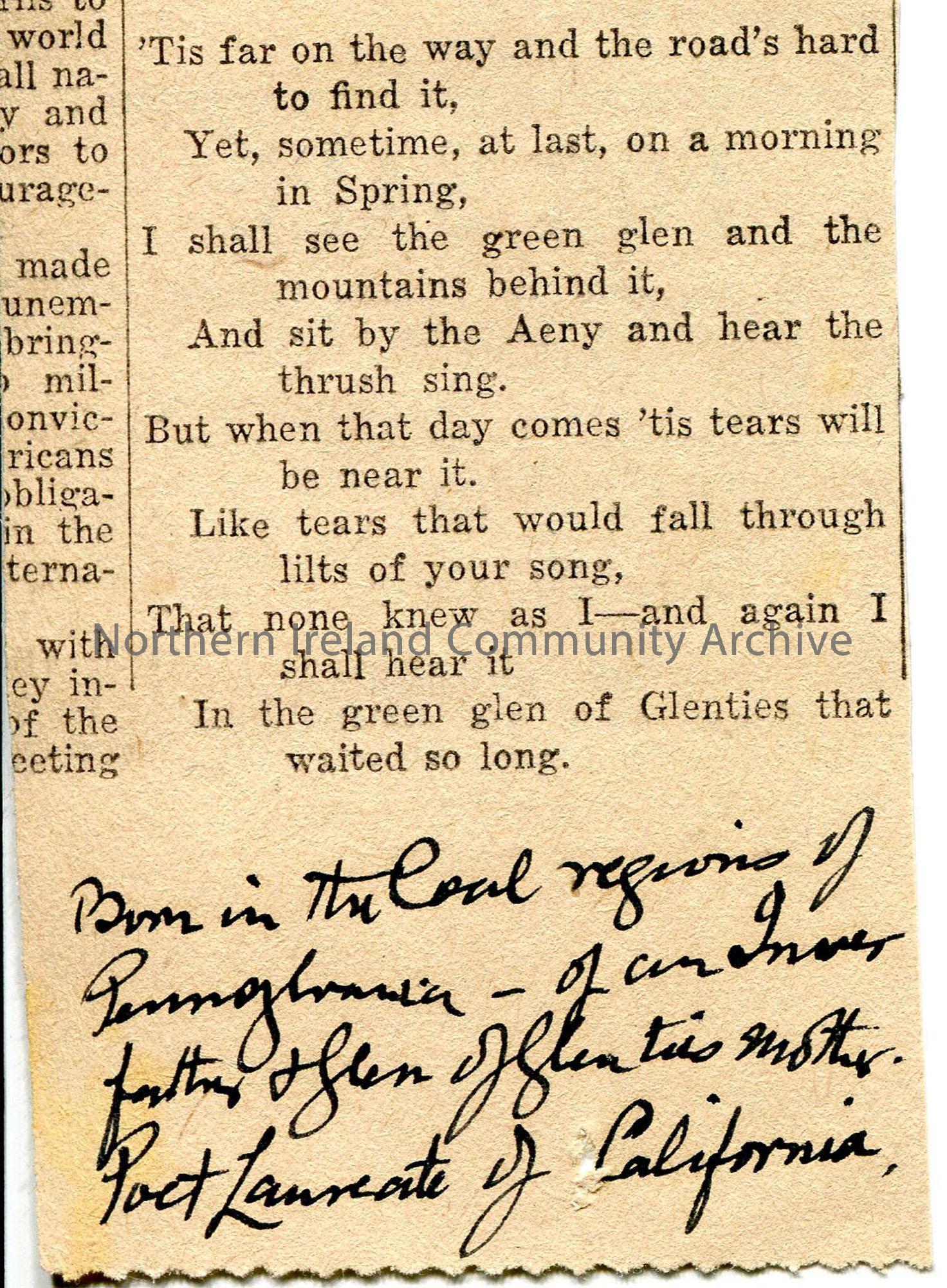 Newspaper cutting of words to ‘The Green Glen of Glenties’ by J S MacGroarty (see attached document). Uses local dialect. – img956