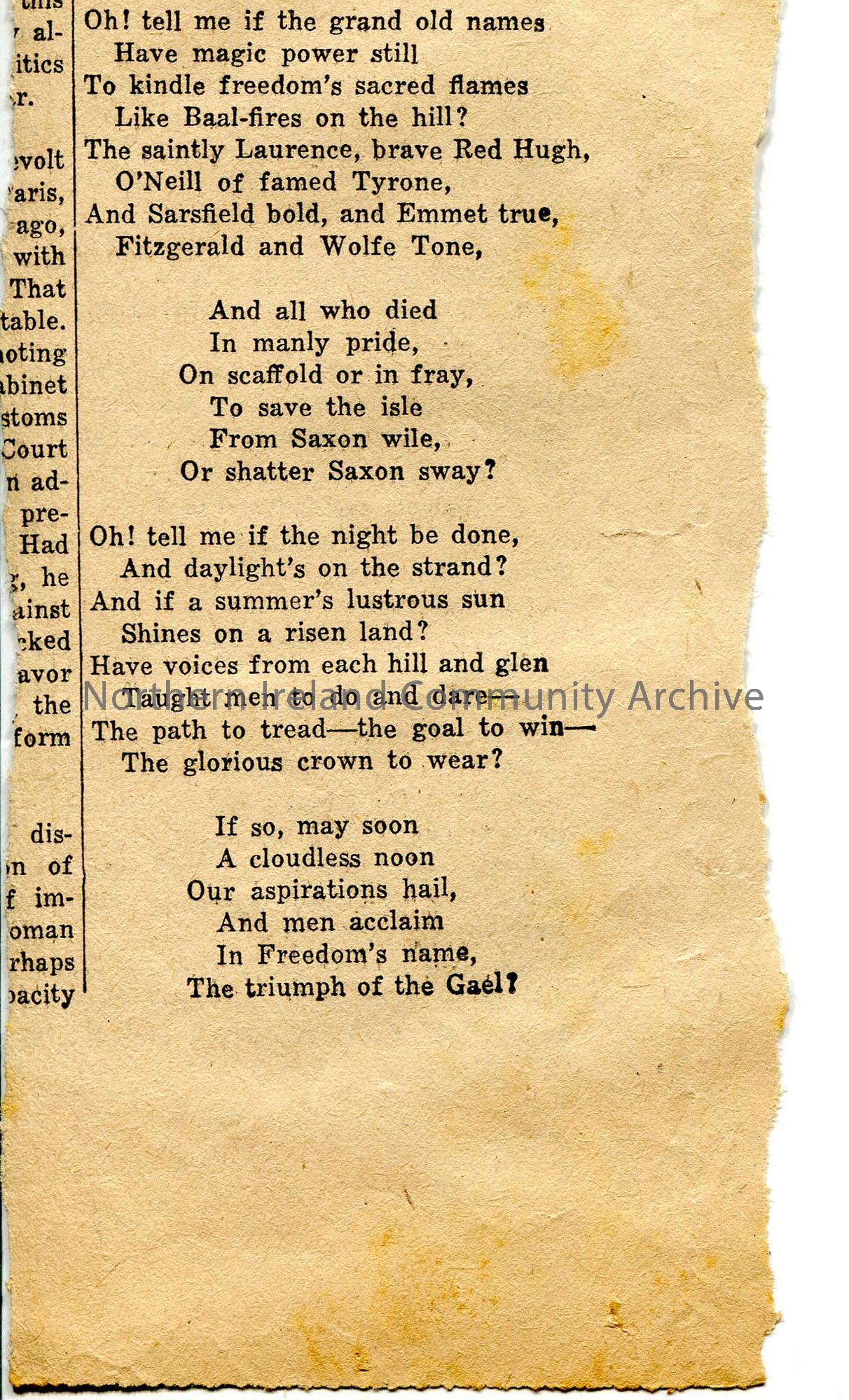 Newspaper cutting of words to ‘The Triumph of the Gael’. Handwritten notes refer to making copies and to outlay of poem. – img960