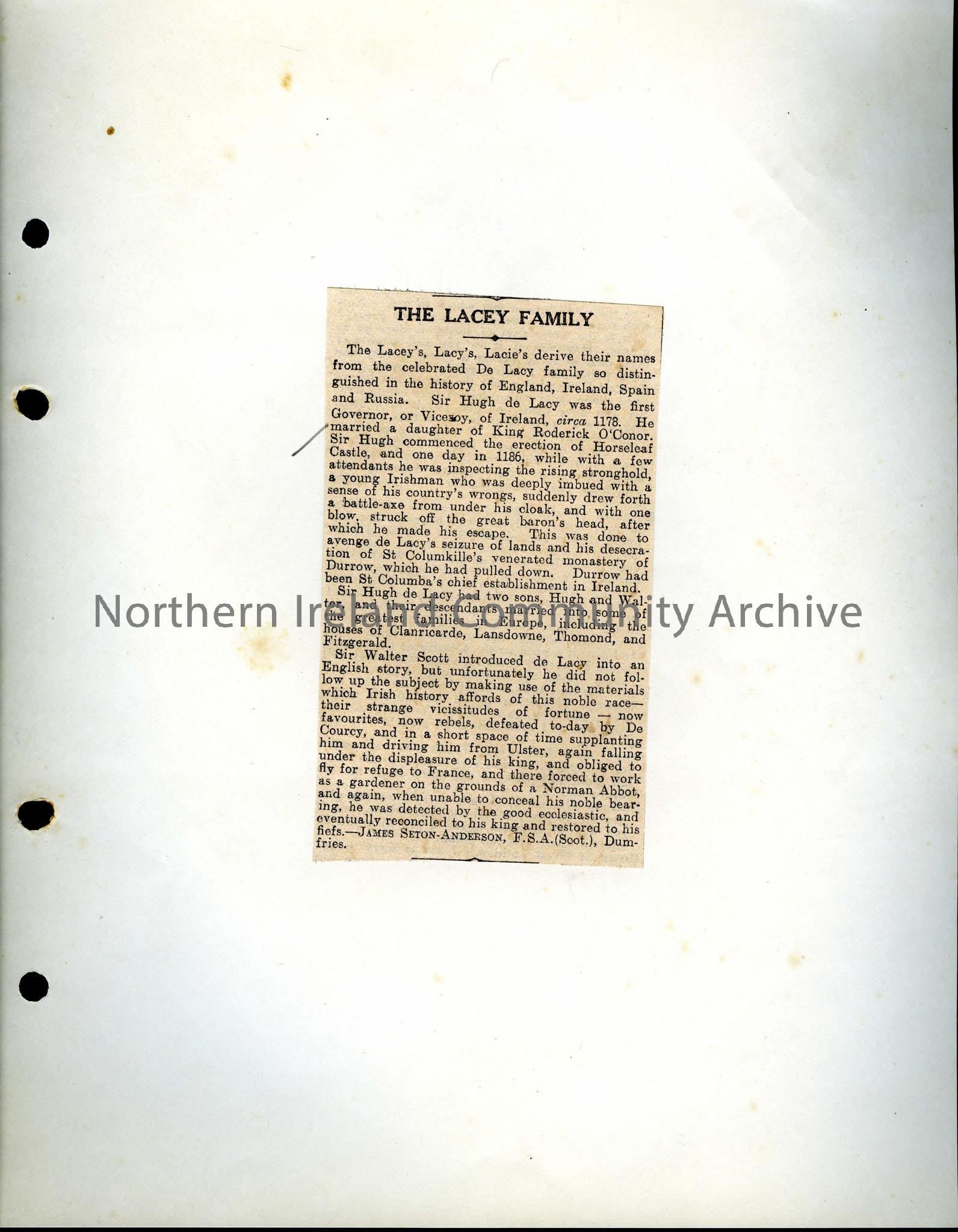 Newspaper cutting on the history of the Lacey family mentioning Sir Hugh de Lacy, his sons, Hugh and Walter, King Roderick O'Connor and Sir Walter Scott. Written by James Seton-Anderson, F.S.A.