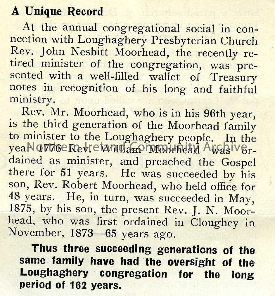 newspaper cutting re retirement of a Rev John Nesbitt Moorhead
