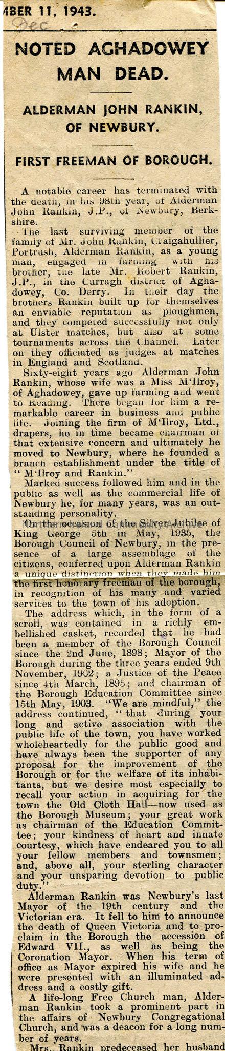 Newspaper cutting relating to death of John Rankin, a resident of Newbury, member of Portrush family and had farmed in Aghadowey- family background, achievements.