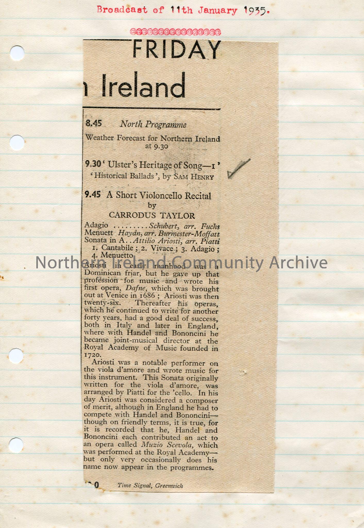 Newspaper cutting stuck to lined paper. Mentions Sam Henry’s broadcast ‘Ulster’s Heritage of Song – I. Historical Ballads.’ Scheduled for 9.30. Tick i…