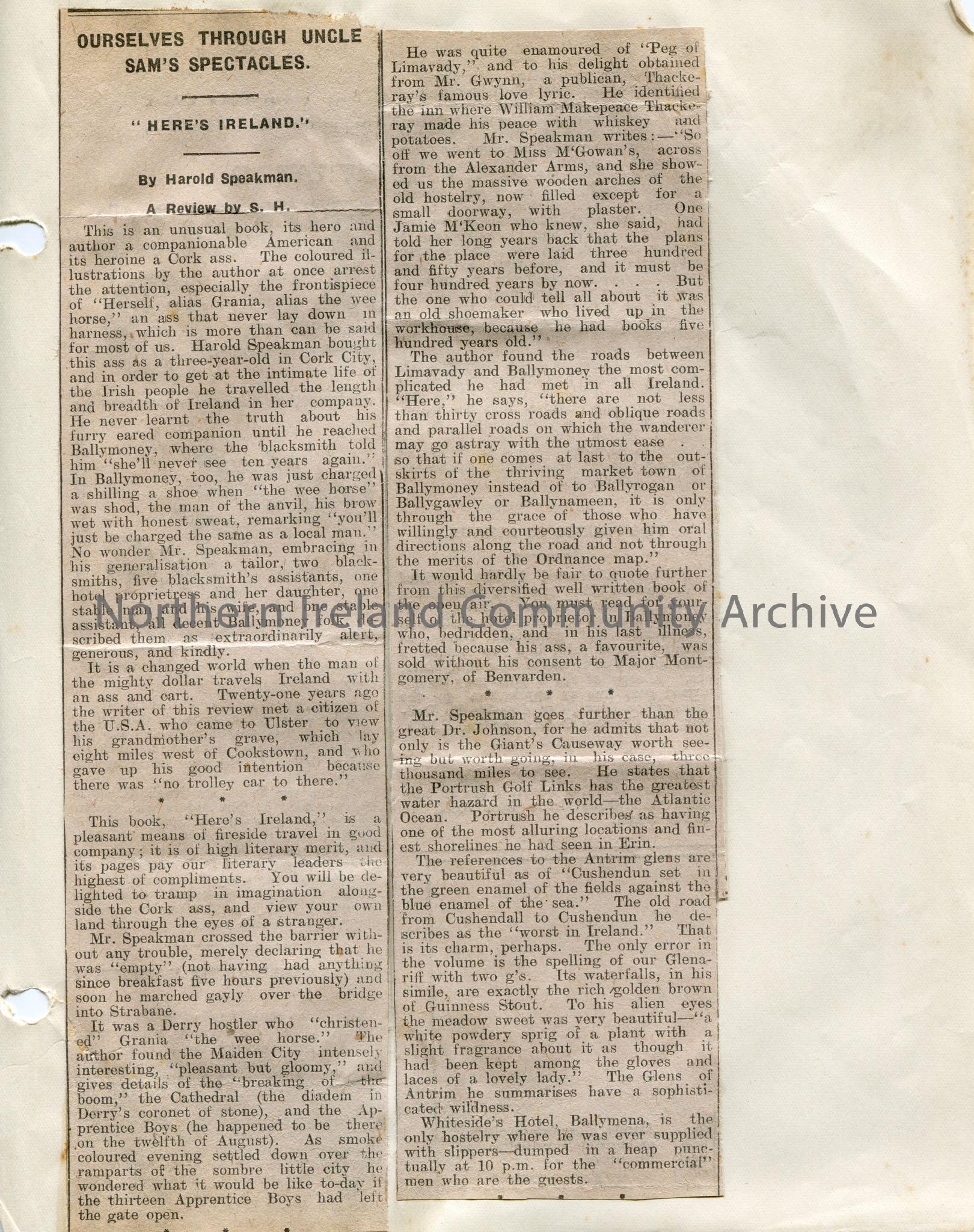 Newspaper cutting stuck to paper titled, 'Ourselves Through Uncle Sam's Spectacles. "Here's Ireland." By Harold Speakman. A Review by S. H.' Sam Henry praises the book in which the author travels through the North of Ireland, namely Derry, Limavady, Ballymoney, Giant's Causeway. Portrush, Glens of Antrim.