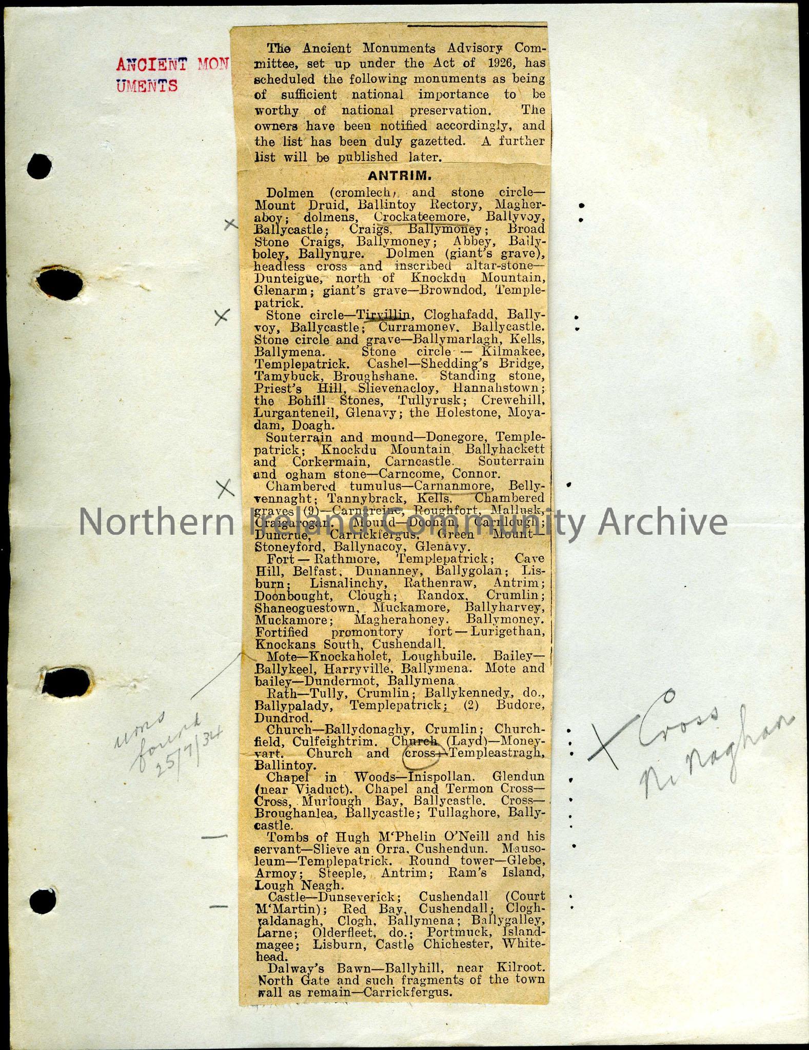 Newspaper cutting 'The Ancient Monuments Advisory Committee'. It lists monuments in Antrim that have been scheduled. Sam has annotated in pencil.