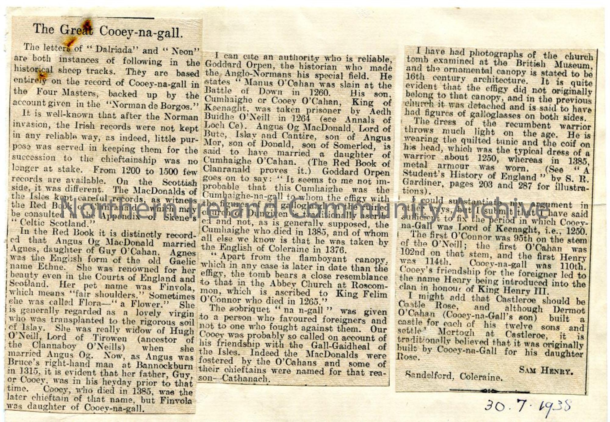 Newspaper cutting affixed to page - letter from Sam Henry with title 'The Great Cooey-na-gall' re O'Cahan family, of genealogical interest, including Scottish links. Mentions Dungiven, Islay, Bannockburn.