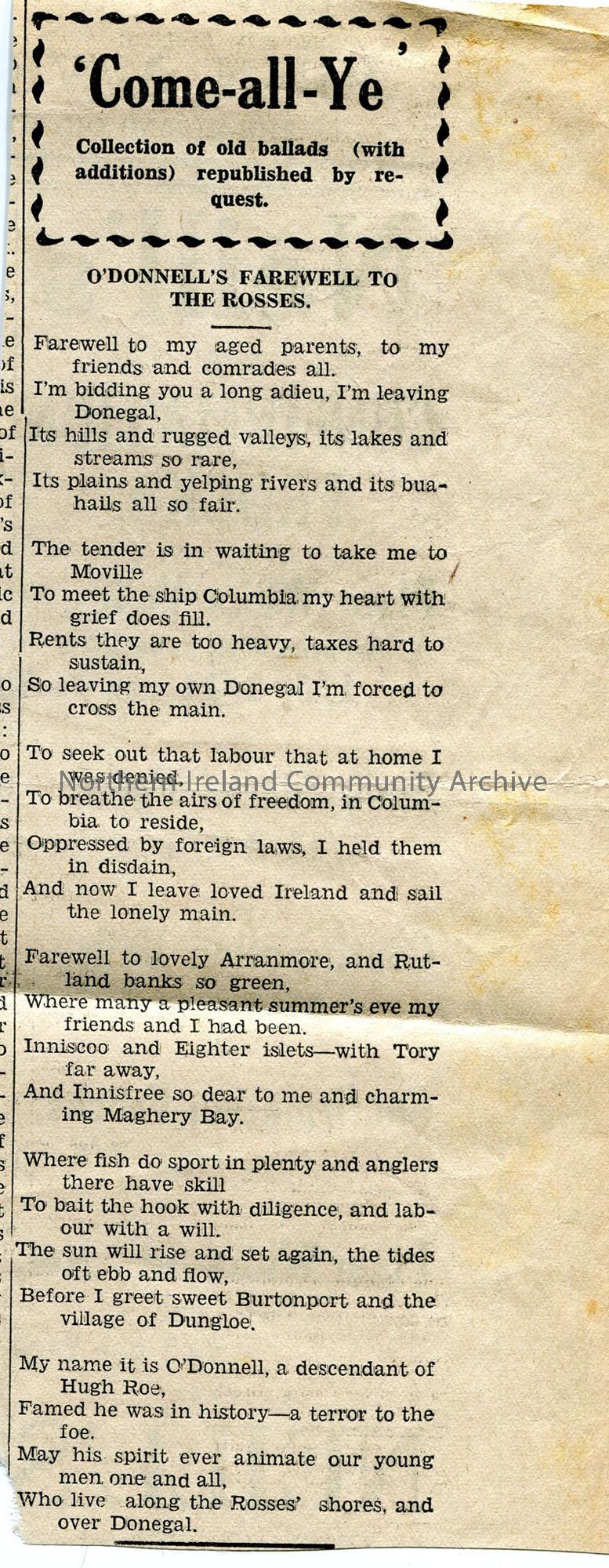 Newspaper cutting under heading paragraph ' 'Come-all-ye' - collection of old ballads (with additions) republished by request'. Words to 'O'Donnell's Farewell to The Rosses'