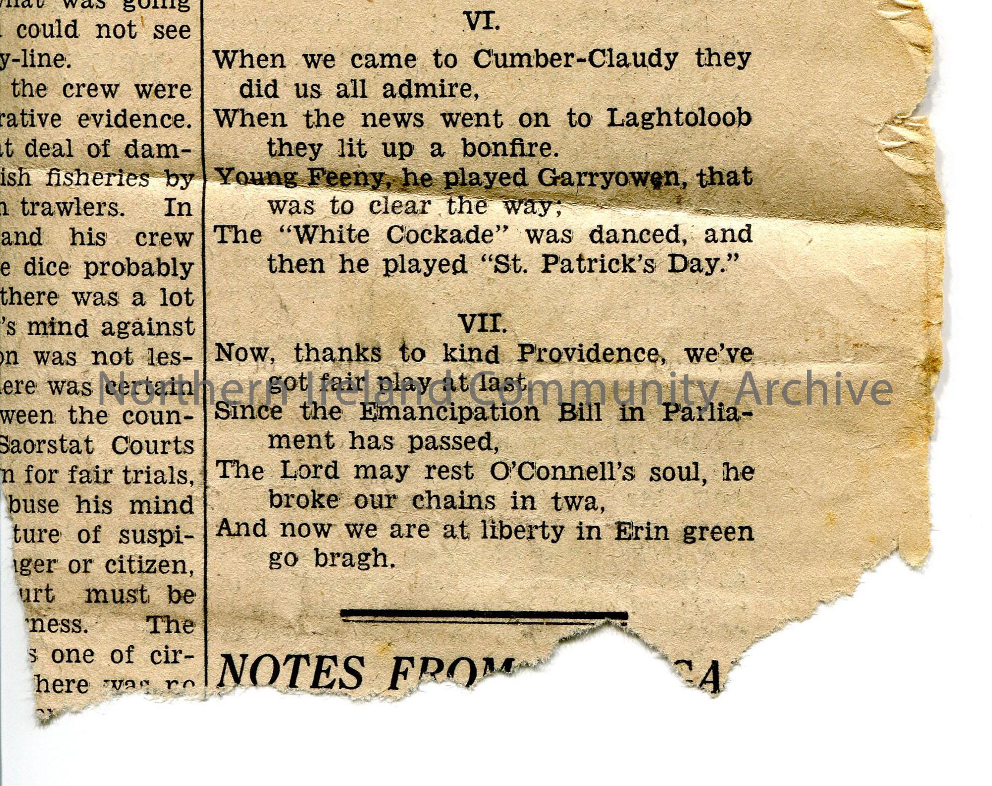 Newspaper cutting under heading paragraph ‘ ‘Come-all-ye’ – collection of old ballads (with additions) republished by request’. Words to ‘The Feeny Bo… – img954