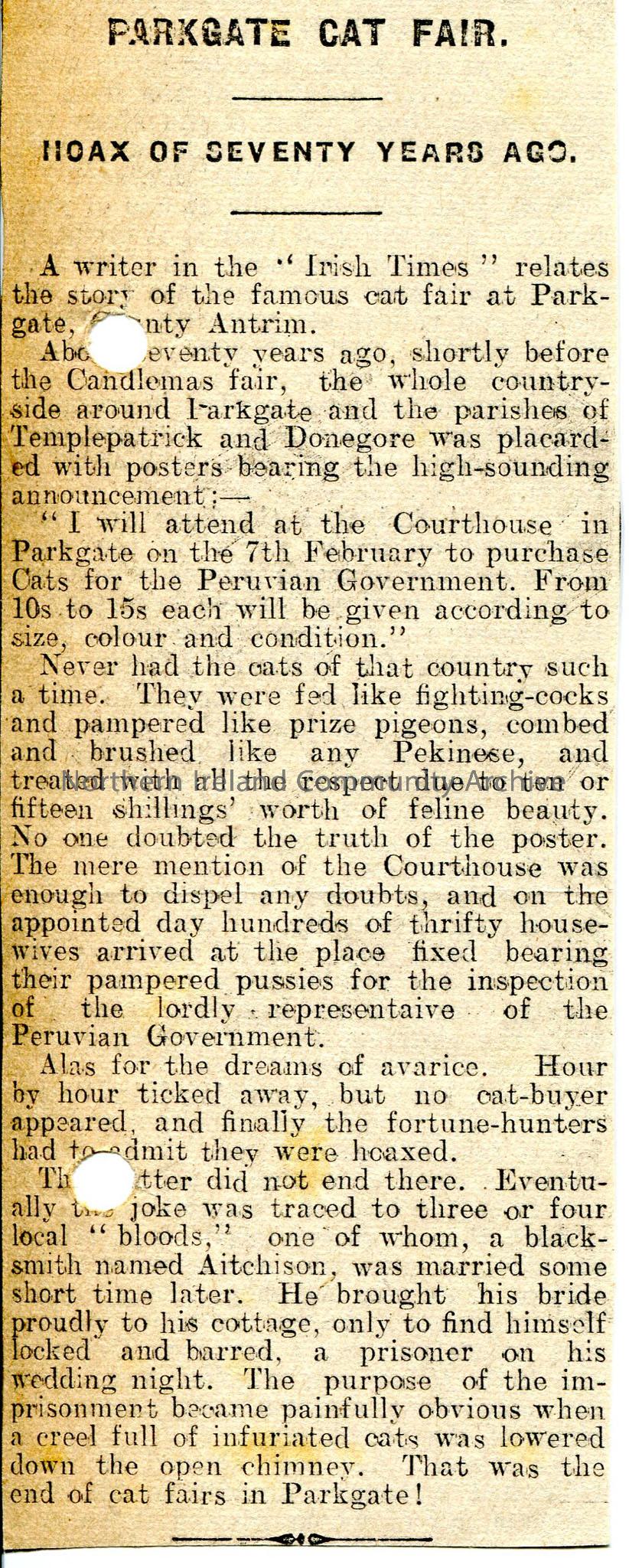 Newspaper cutting with title 'Parkgate Cat Fair - Hoax of seventy Years Ago'