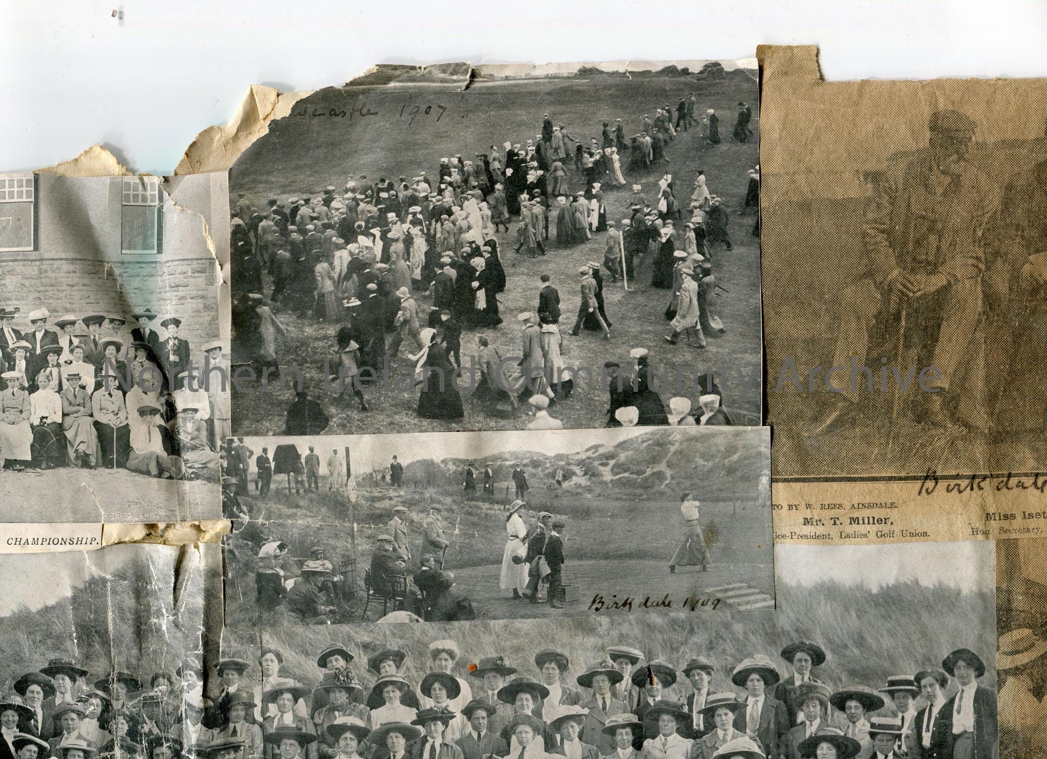 Newspaper cuttings of photographs stuck to paper re 'The Ladies Golf Tournament, Birkdale, 1909', images titled, 'England', 'Ireland', 'Scotland', and 'Wales'. Names captioned, 'Mr T. Miller', 'Miss Isette Pearson' and 'Mr J. Talbot Fair'. 'The Competitors for the Irish Ladies' Golf Championship, 1907', and Birkdale, 1906, names on images, 'Mrs Sumpter', 'Miss Bertha Thompson', 'Mrs Kennion', Miss D. Campbell'.