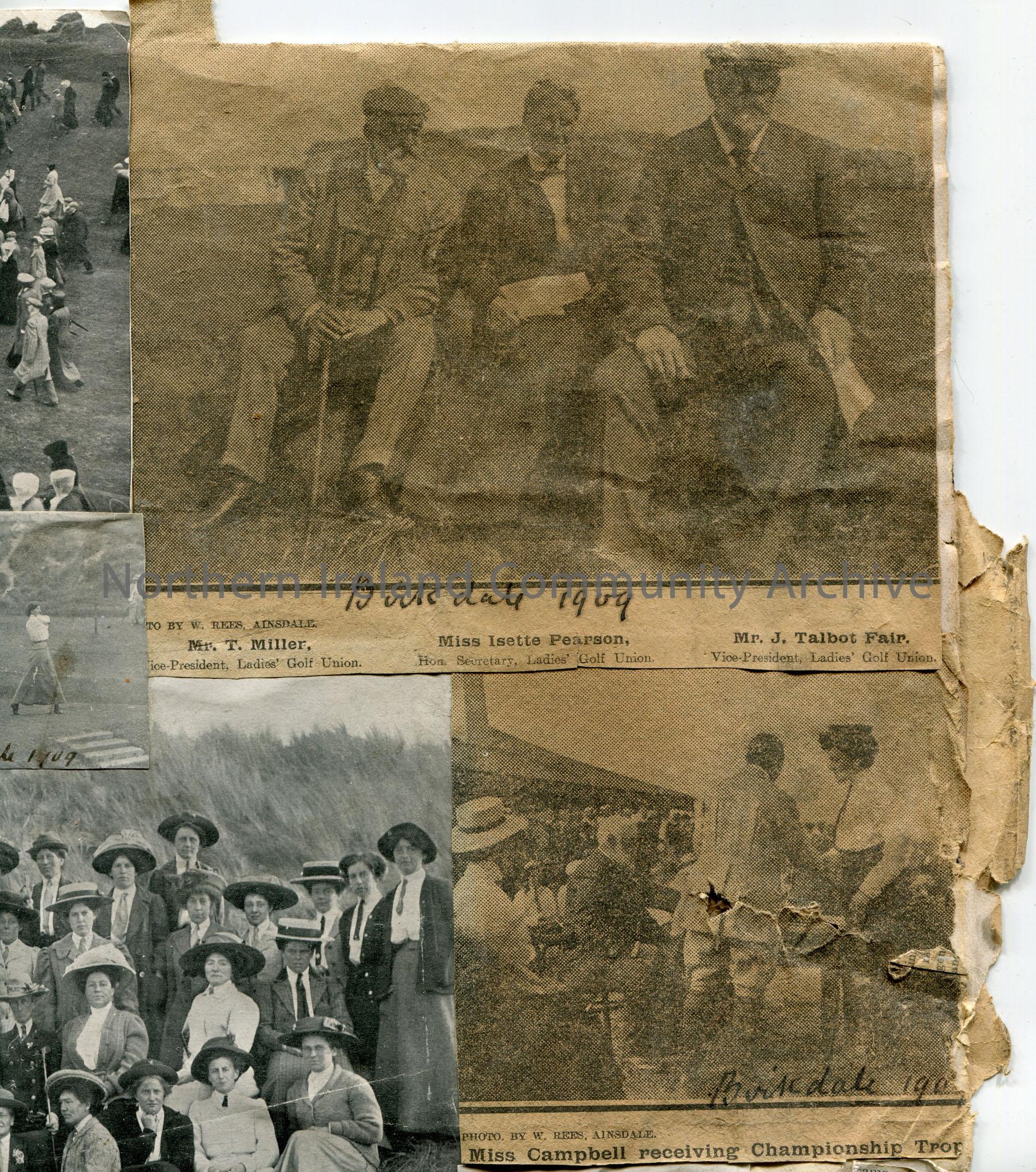 Newspaper cuttings of photographs stuck to paper re 'The Ladies Golf Tournament, Birkdale, 1909', images titled, 'England', 'Ireland', 'Scotland', and 'Wales'. Names captioned, 'Mr T. Miller', 'Miss Isette Pearson' and 'Mr J. Talbot Fair'. 'The Competitors for the Irish Ladies' Golf Championship, 1907', and Birkdale, 1906, names on images, 'Mrs Sumpter', 'Miss Bertha Thompson', 'Mrs Kennion', Miss D. Campbell'.