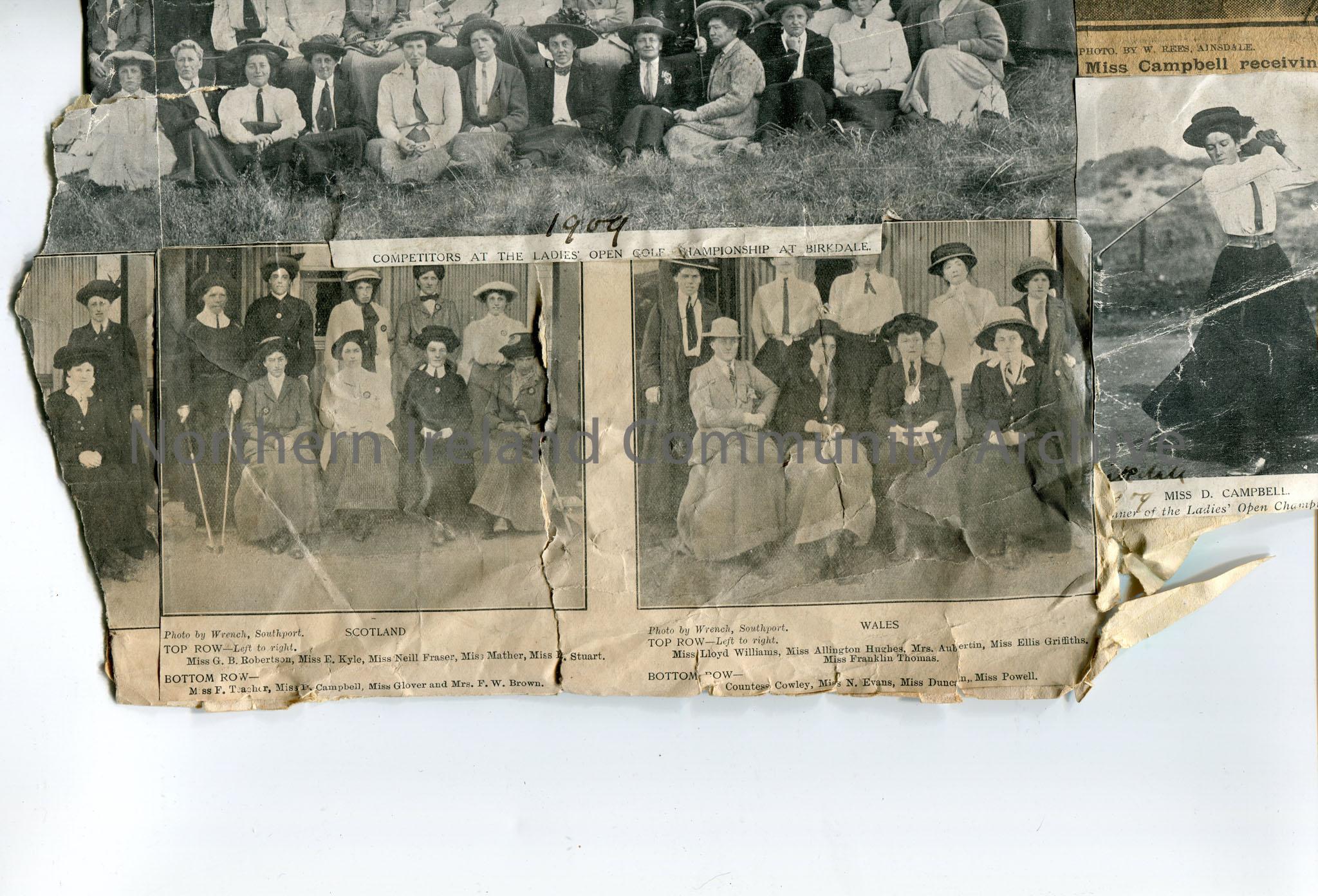 Newspaper cuttings of photographs stuck to paper re 'The Ladies Golf Tournament, Birkdale, 1909', images titled, 'England', 'Ireland', 'Scotland', and 'Wales'. Names captioned, 'Mr T. Miller', 'Miss Isette Pearson' and 'Mr J. Talbot Fair'. 'The Competitors for the Irish Ladies' Golf Championship, 1907', and Birkdale, 1906, names on images, 'Mrs Sumpter', 'Miss Bertha Thompson', 'Mrs Kennion', Miss D. Campbell'.