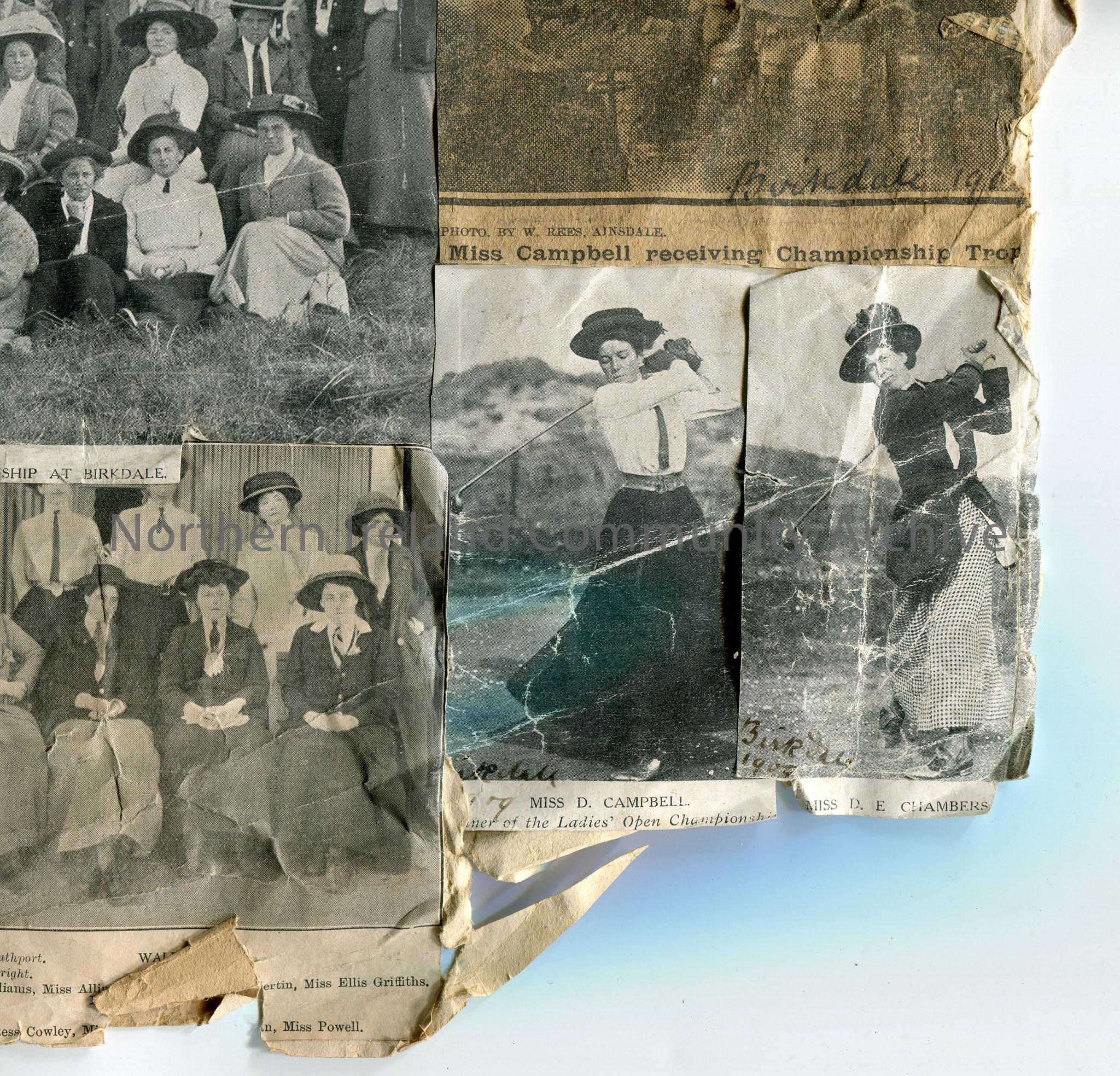 Newspaper cuttings of photographs stuck to paper re 'The Ladies Golf Tournament, Birkdale, 1909', images titled, 'England', 'Ireland', 'Scotland', and 'Wales'. Names captioned, 'Mr T. Miller', 'Miss Isette Pearson' and 'Mr J. Talbot Fair'. 'The Competitors for the Irish Ladies' Golf Championship, 1907', and Birkdale, 1906, names on images, 'Mrs Sumpter', 'Miss Bertha Thompson', 'Mrs Kennion', Miss D. Campbell'.