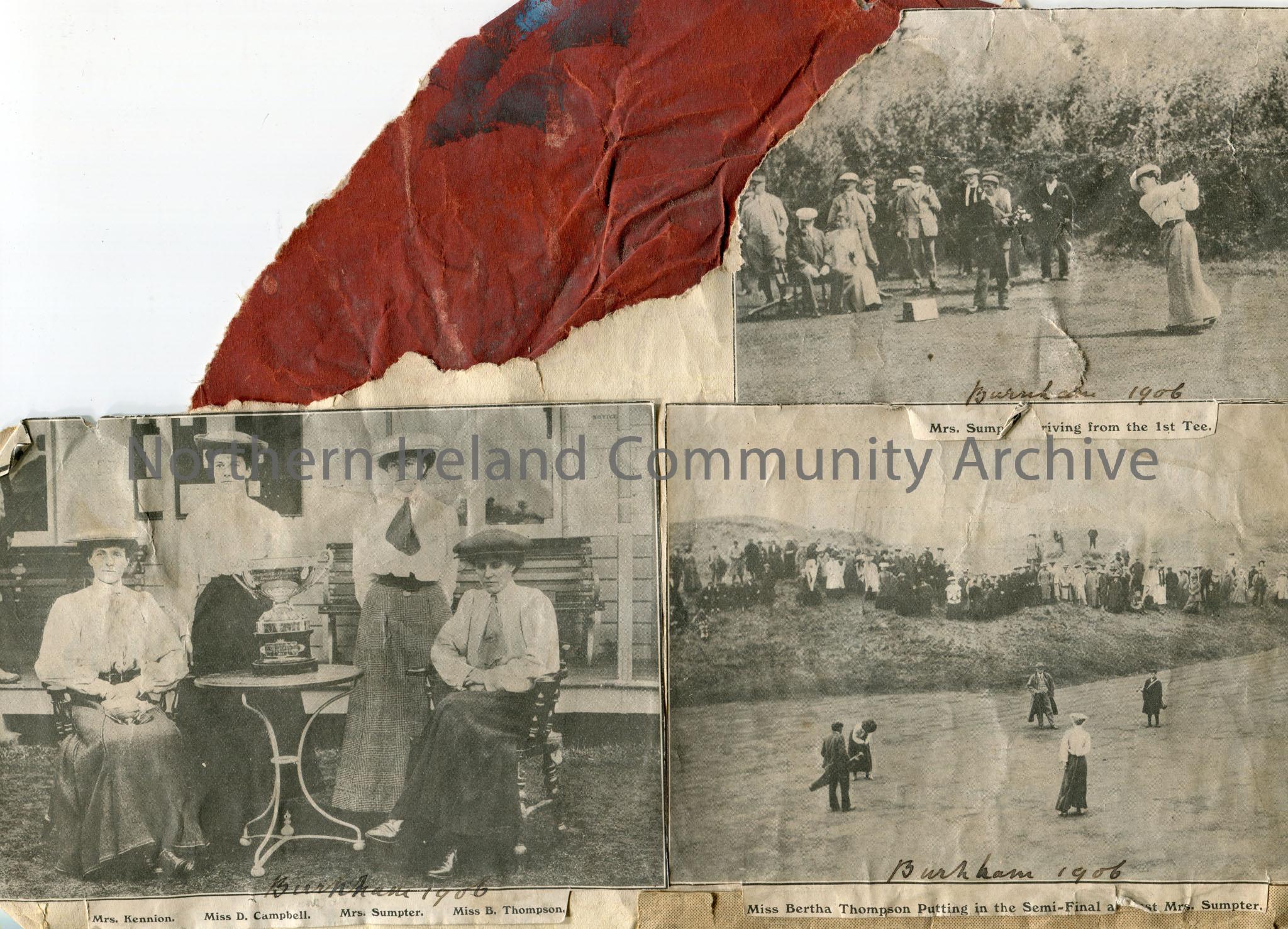 Newspaper cuttings of photographs stuck to paper re 'The Ladies Golf Tournament, Birkdale, 1909', images titled, 'England', 'Ireland', 'Scotland', and 'Wales'. Names captioned, 'Mr T. Miller', 'Miss Isette Pearson' and 'Mr J. Talbot Fair'. 'The Competitors for the Irish Ladies' Golf Championship, 1907', and Birkdale, 1906, names on images, 'Mrs Sumpter', 'Miss Bertha Thompson', 'Mrs Kennion', Miss D. Campbell'.