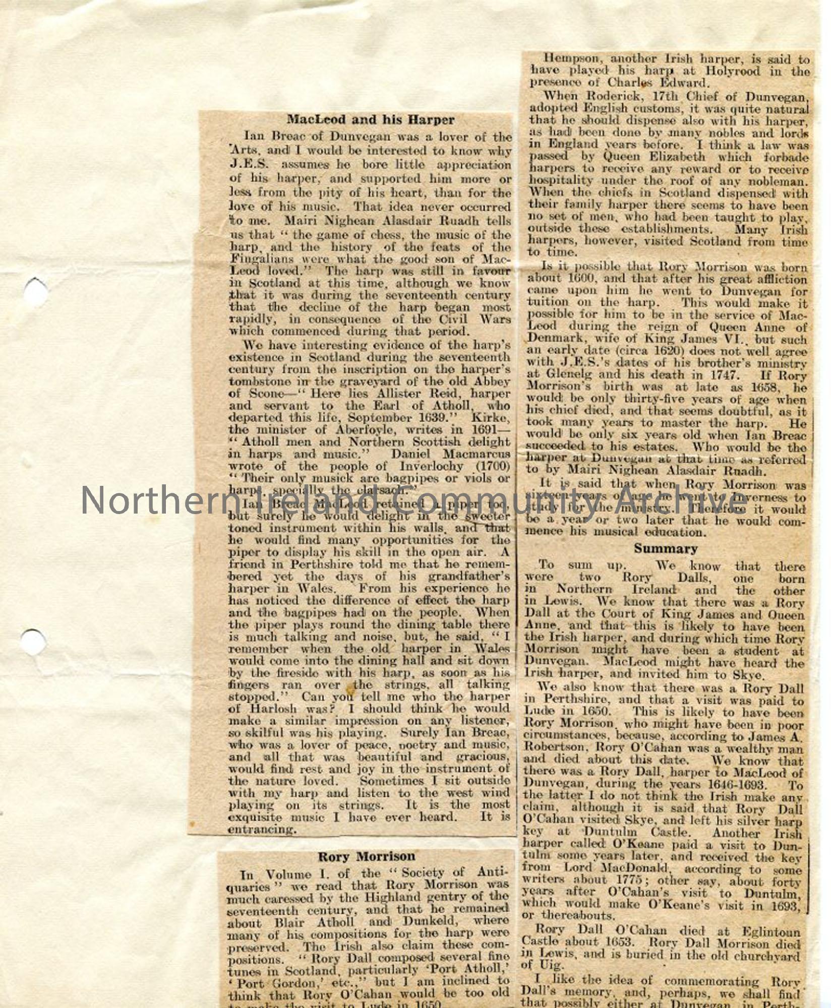 Two newspaper cuttings affixed to page. Re: the 'two' Rory Dalls - the O'Cahan and the Morrison - and other harpers in Scotland, including Hempson.