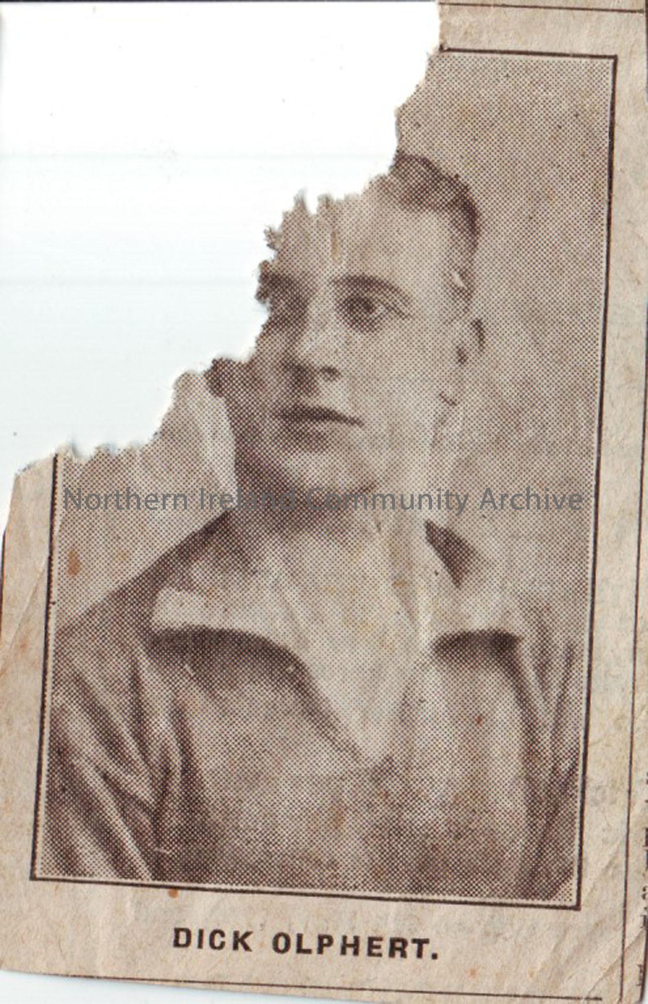 Newspaper cuttings relating to obituaries of several Ballymoney residents and a damaged photograph of Dick Olphert