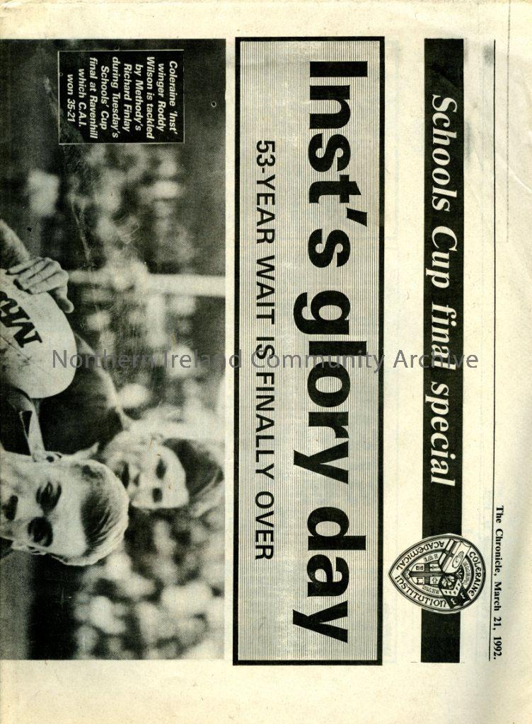 Newspaper supplement from the Coleraine Chronicle, March 21, 1992, titled 'Inst's glory day 53-year wait is finally over'. The supplement is celebrating C.A.I's win of the Schools' Cup against Methody at Ravenhill.