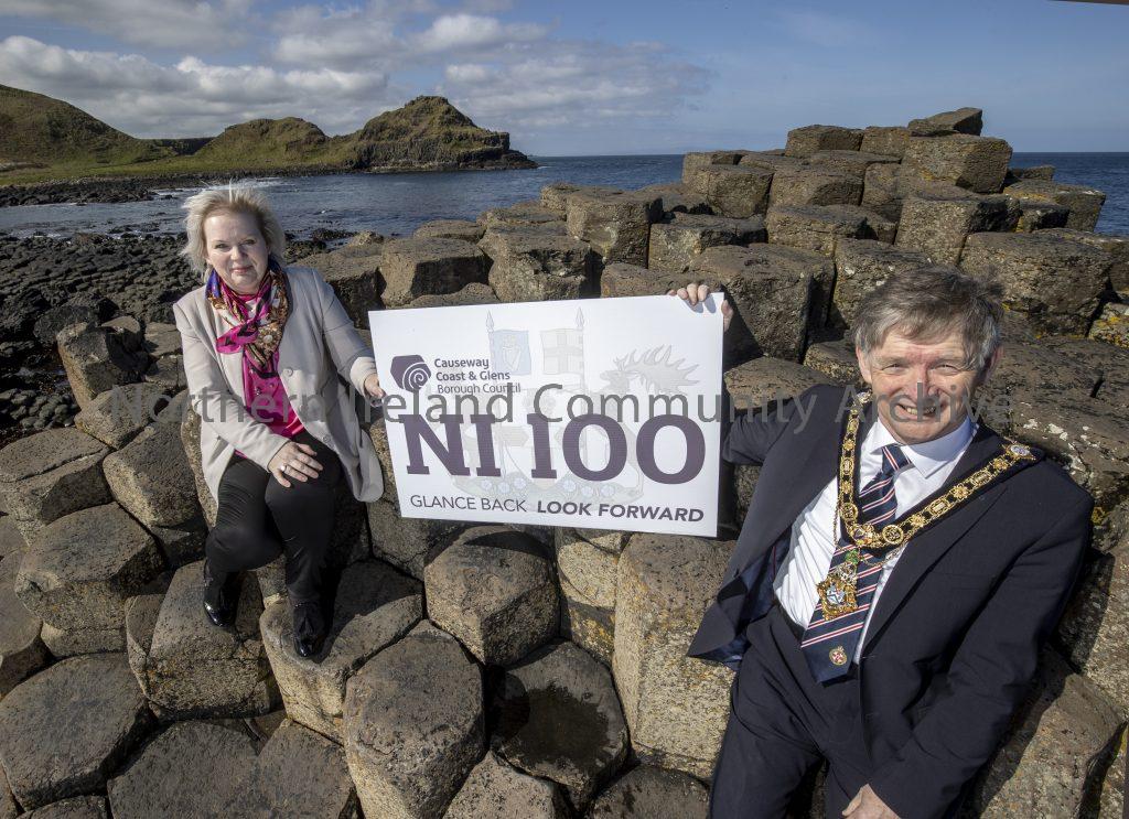 The Mayor of Causeway Coast and Glens Borough Council Alderman Mark Fielding and Councillor Michelle Knight McQuillan, Chair of Council’s NI 100 Working Group, pictured at the Giant’s Causeway, Northern Ireland’s only World Heritage Site, for the official launch of Council’s NI 100 programme of events.