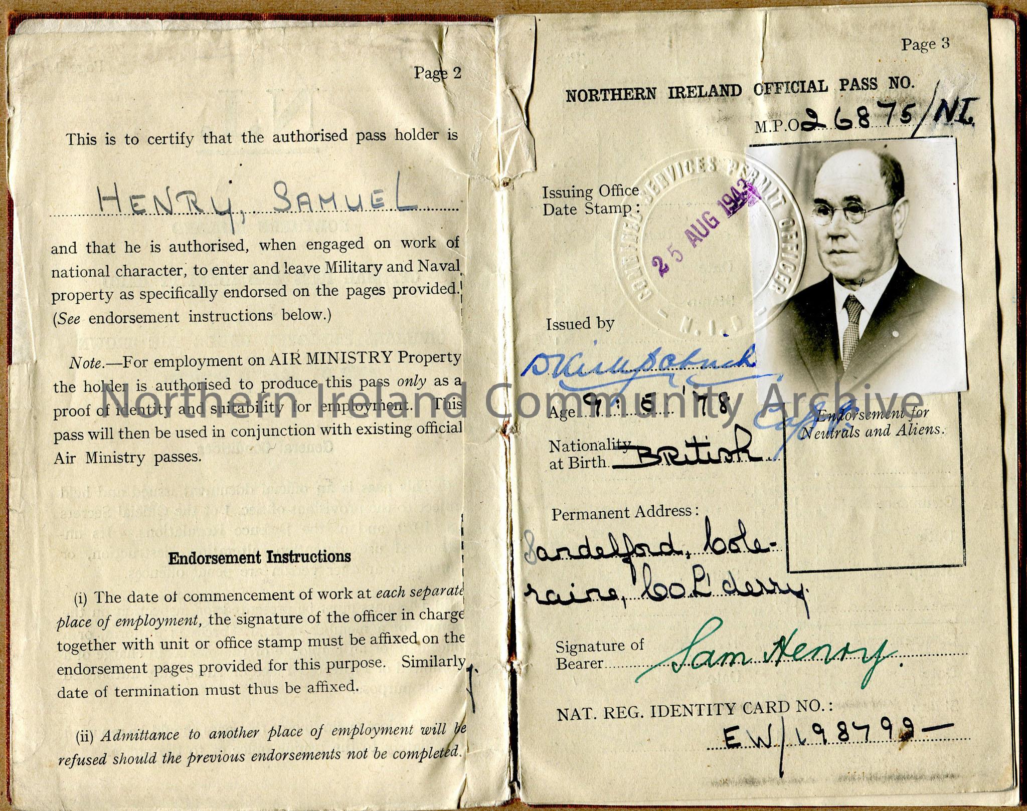 N.I. Official Pass and Identity Card belonging to Sam Henry. Issued 25 August, 1943. Includes photograph of Sam Henry on page 3. The pass was issued for civilians employed under the Crown and by Allied Forces. It authorised Sam Henry to enter all Military Camps and Barracks in Northern Ireland for duties as Lecturer for Command Education Officer.
