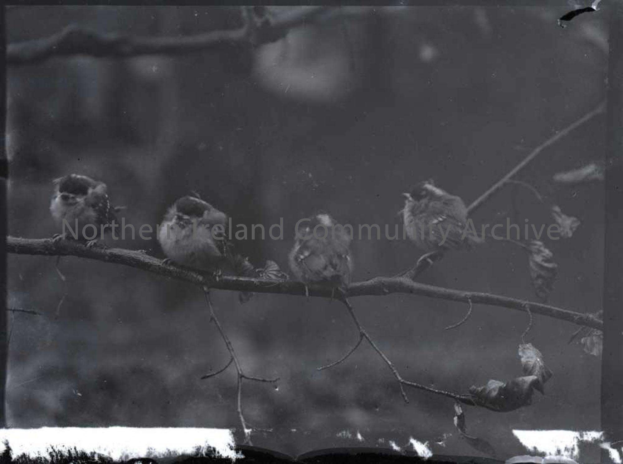 Young Coal Tits (Entitled Nightjar's nest but shows 4 small birds on a branch. No 113 in Nature Slides inventory)