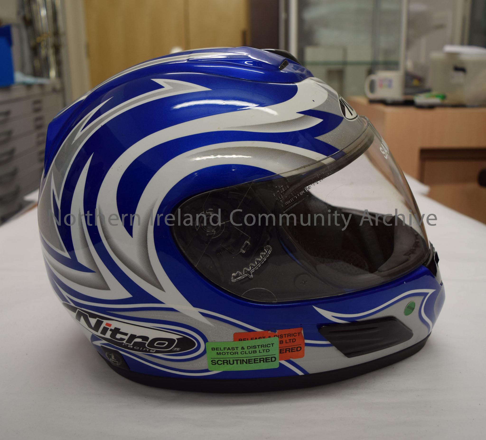 Nitro Racing helmet with Sammy Bentley written on it. Blue with white and silver/grey art. – 2016.32 (5)