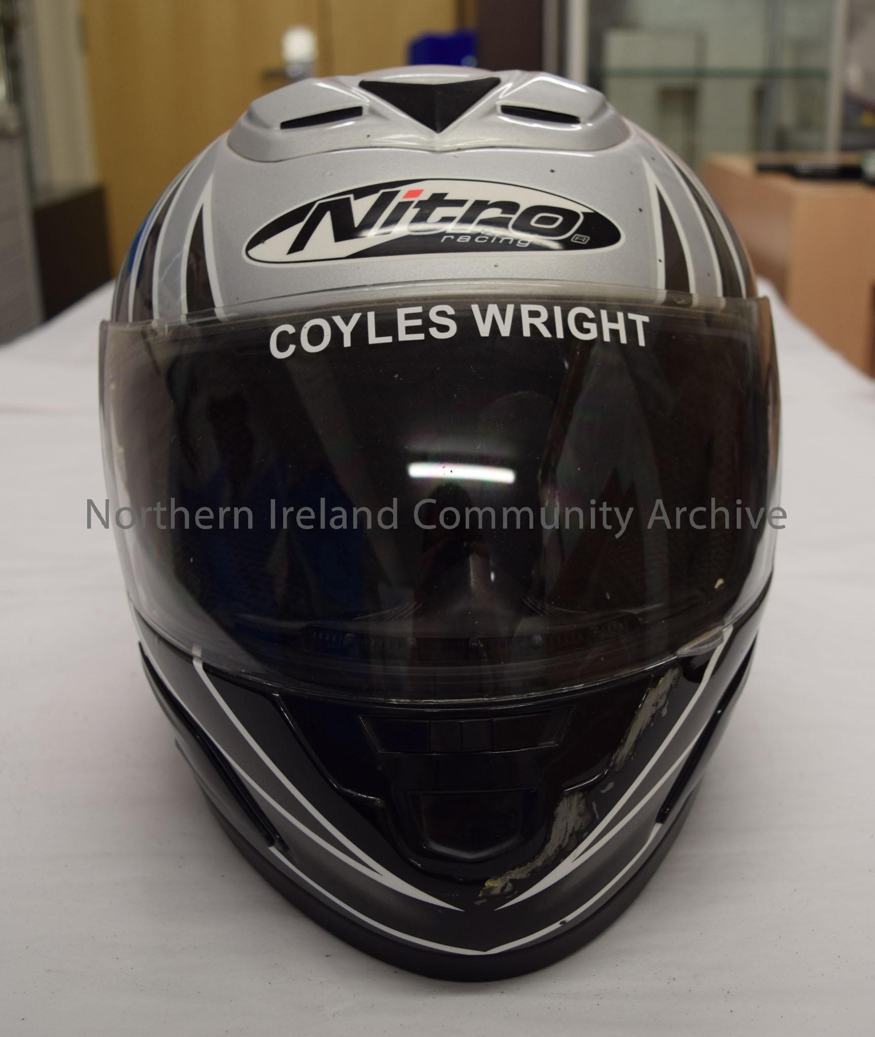 Nitro Racing motorcycle helmet belonging to Coyles Wright. Silver helmet with dark grey, black and white zigzag pattern across it.
