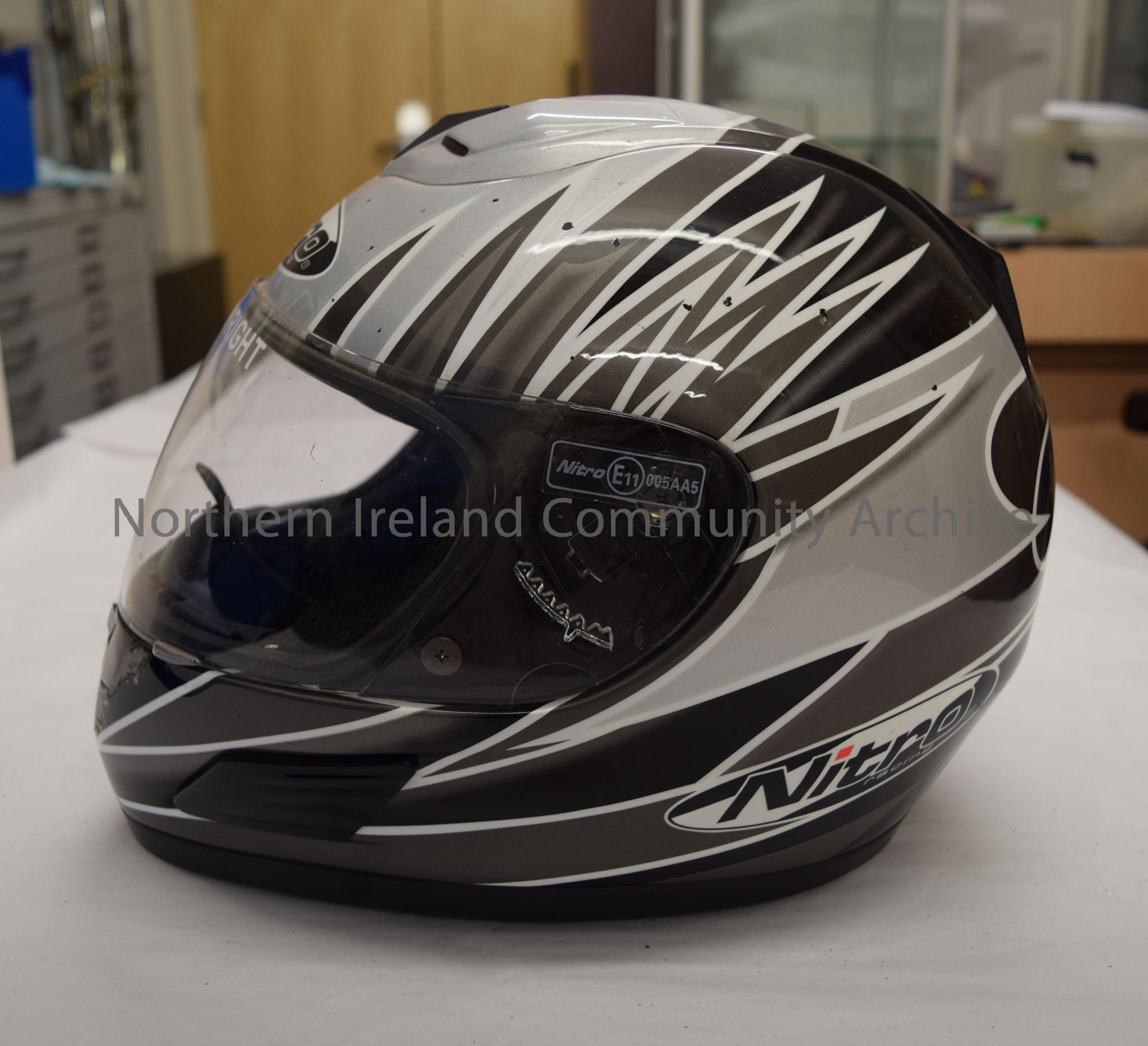 Nitro Racing motorcycle helmet belonging to Coyles Wright. Silver helmet with dark grey, black and white zigzag pattern across it.